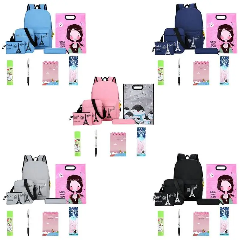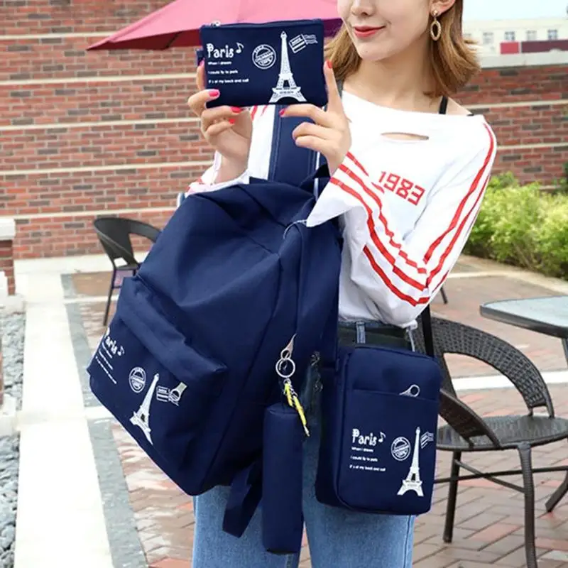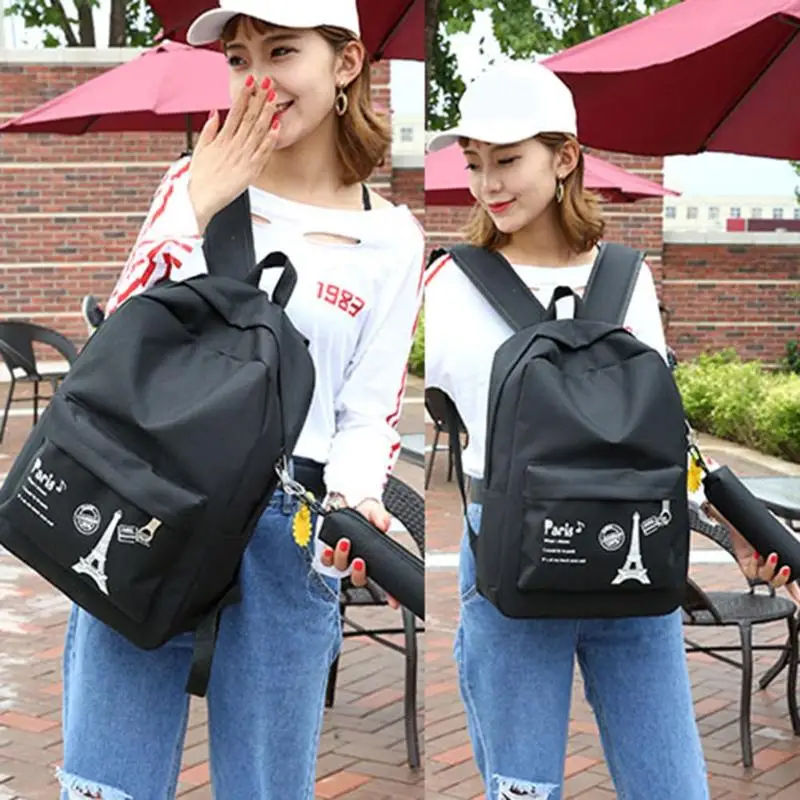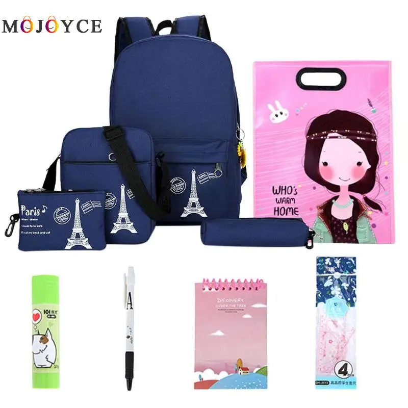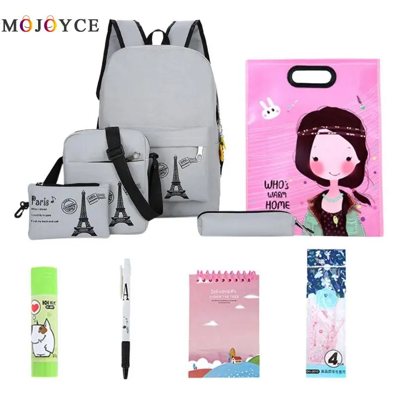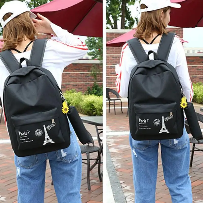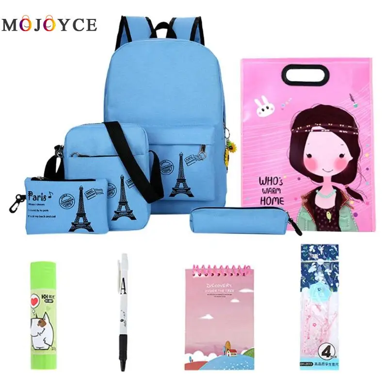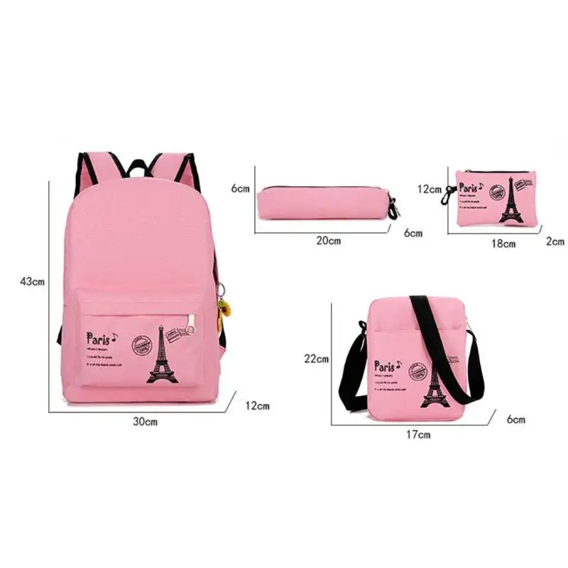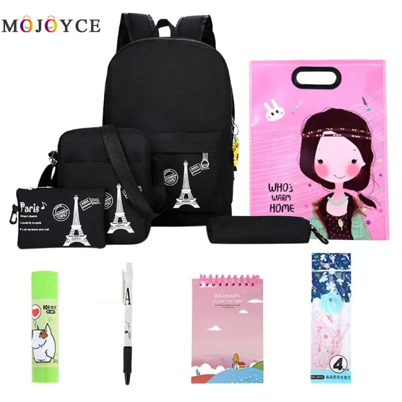 10pcs/Set Casual Women Canvas Iron Tower Printed Backpacks Teen Girls School Composite Shoulder Bags