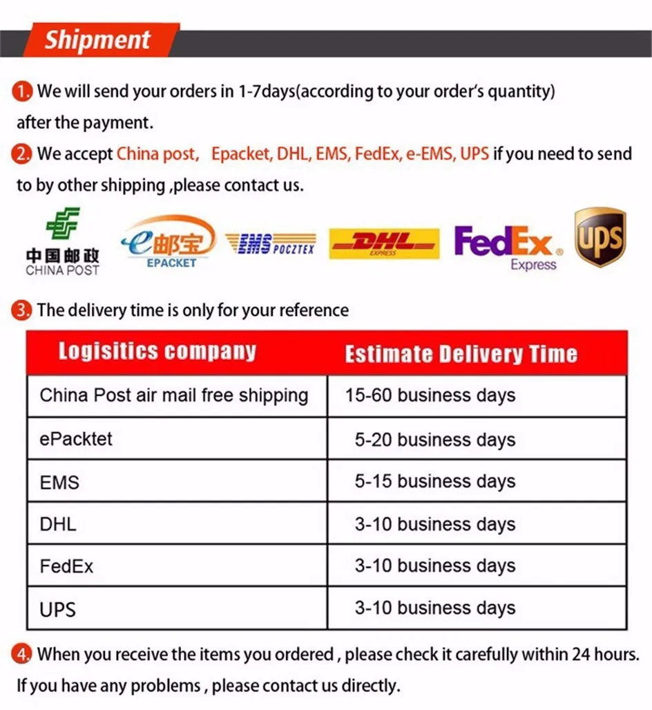 Packages from our warehouse in China will be shipped by ePacket or EMS depending on the weight and size of the product. Packages shipped from our US warehouse are shipped through USPS.