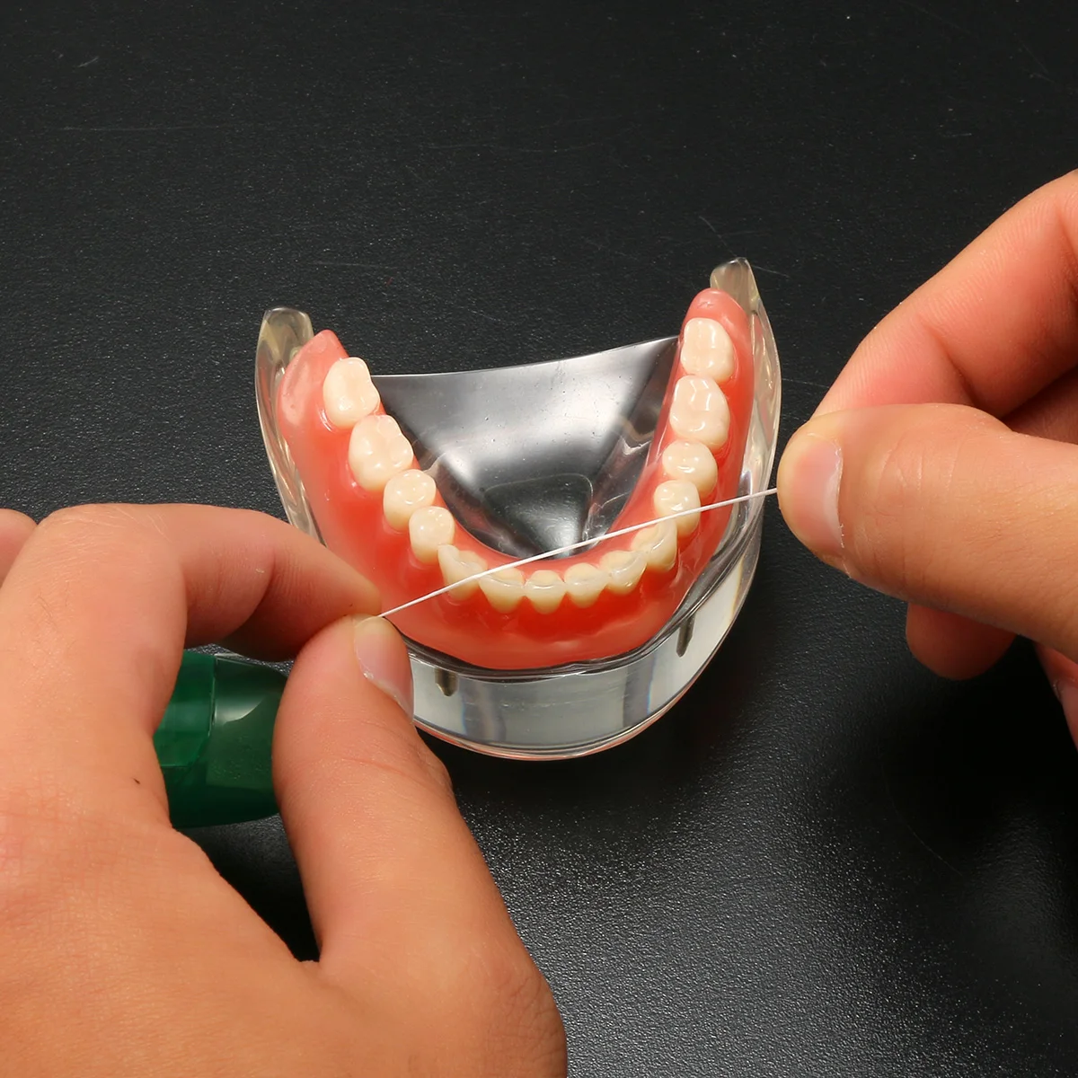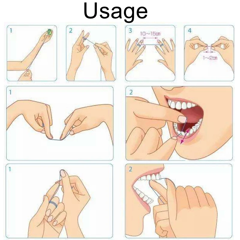 .Wind ends of floss around the middle finger of each hand,leaving about 10cm(4inches)pf floss between them,then tighten with thumb and forefinger