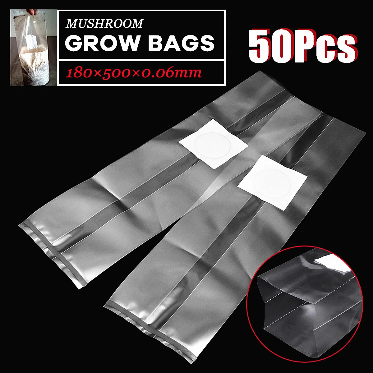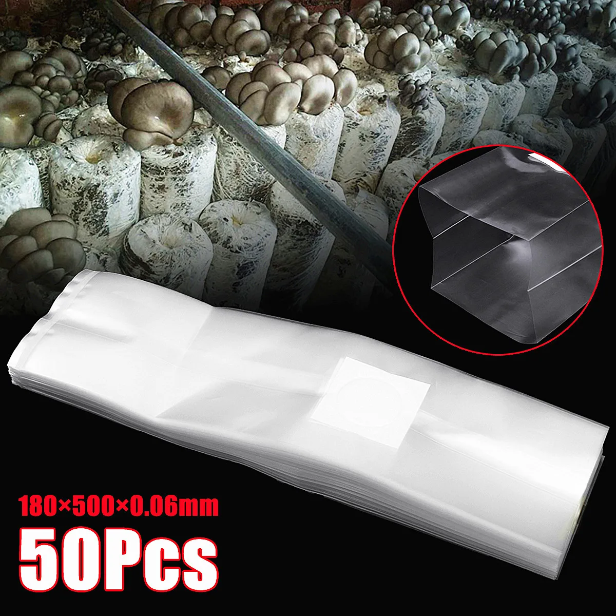 Name: 50Pcs 180x500x0.06mm PVC Mushroom Grow Bag Substrate High temp Pre Sealable