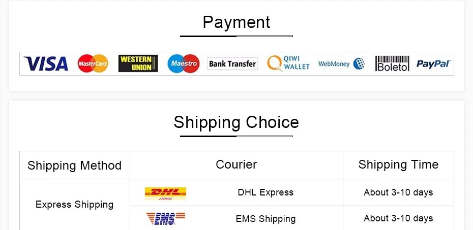 Packages from our warehouse in China will be shipped by ePacket or EMS depending on the weight and size of the product. Packages shipped from our US warehouse are shipped through USPS.