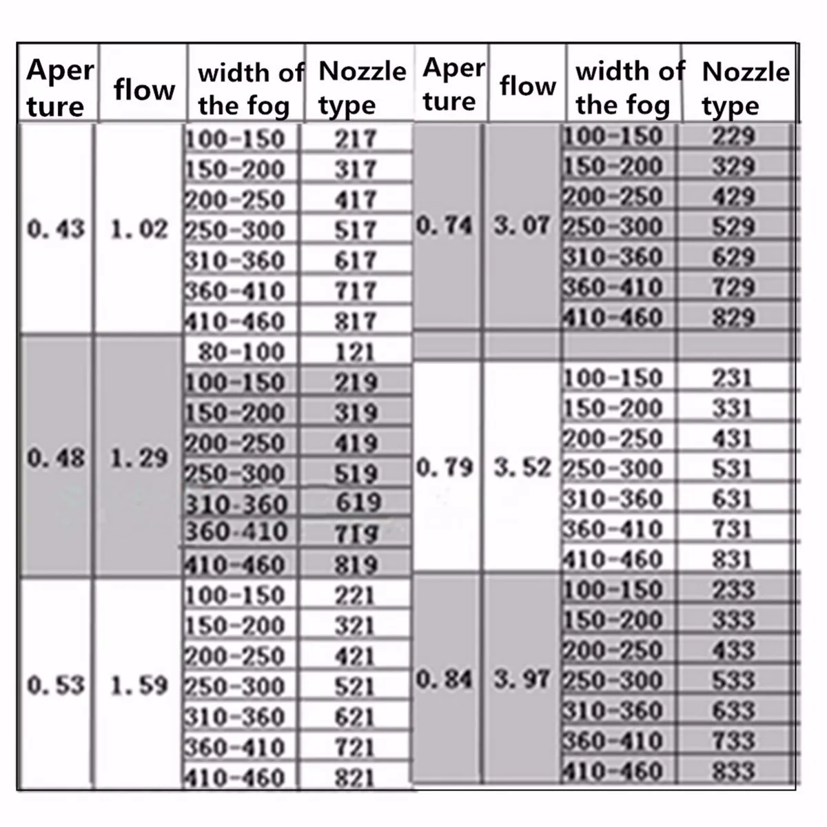 -Front digit represents the spray rate, the larger the number, the wider the spray pattern, followed by two representatives of the flow, the larger the number, the greater the flow, a larger caliber nozzle.