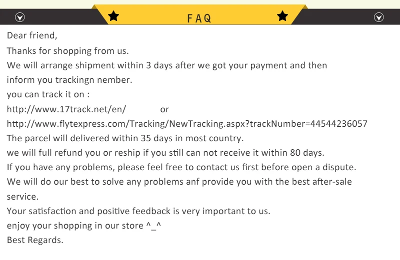 • If you did not receive the product within the guaranteed time( 45 days not including 2-5 day processing) you can request a refund or a reshipment.