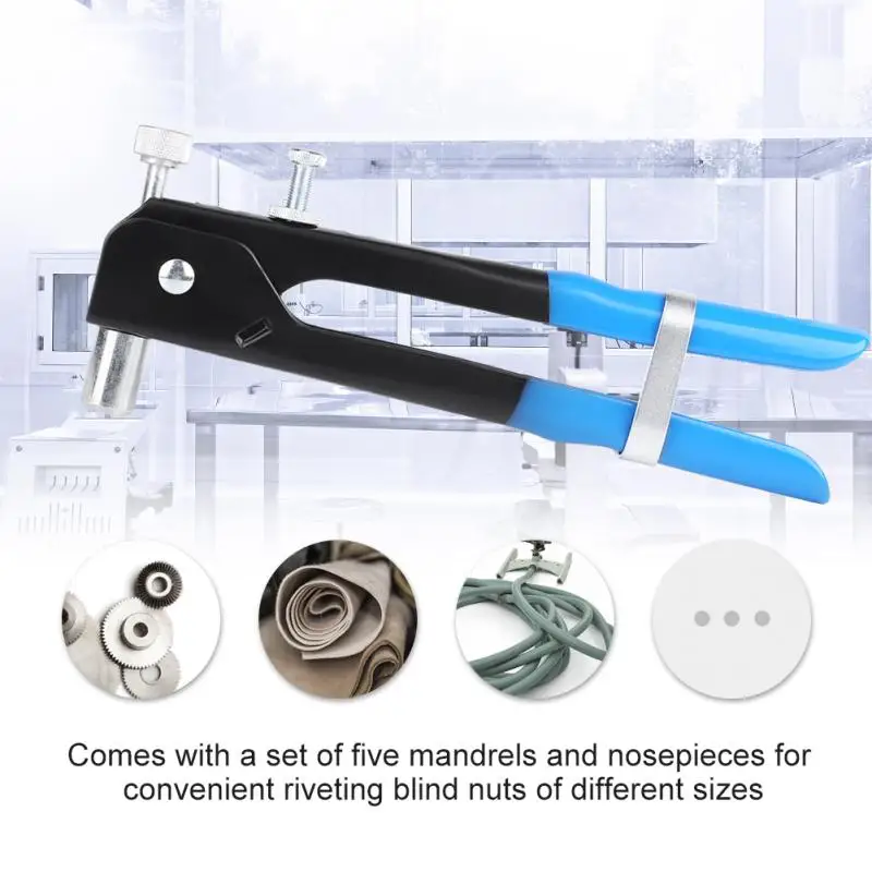 - Comes with a set of five mandrels and nosepieces for convenient riveting blind nuts of different sizes.