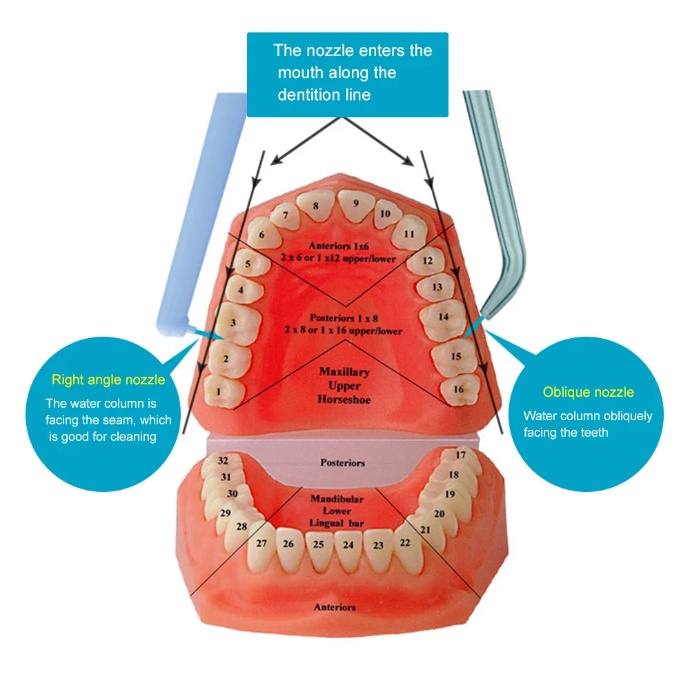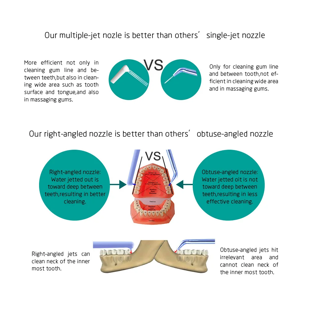 the angle of the water jet is 90 degree, can help clean teeth better