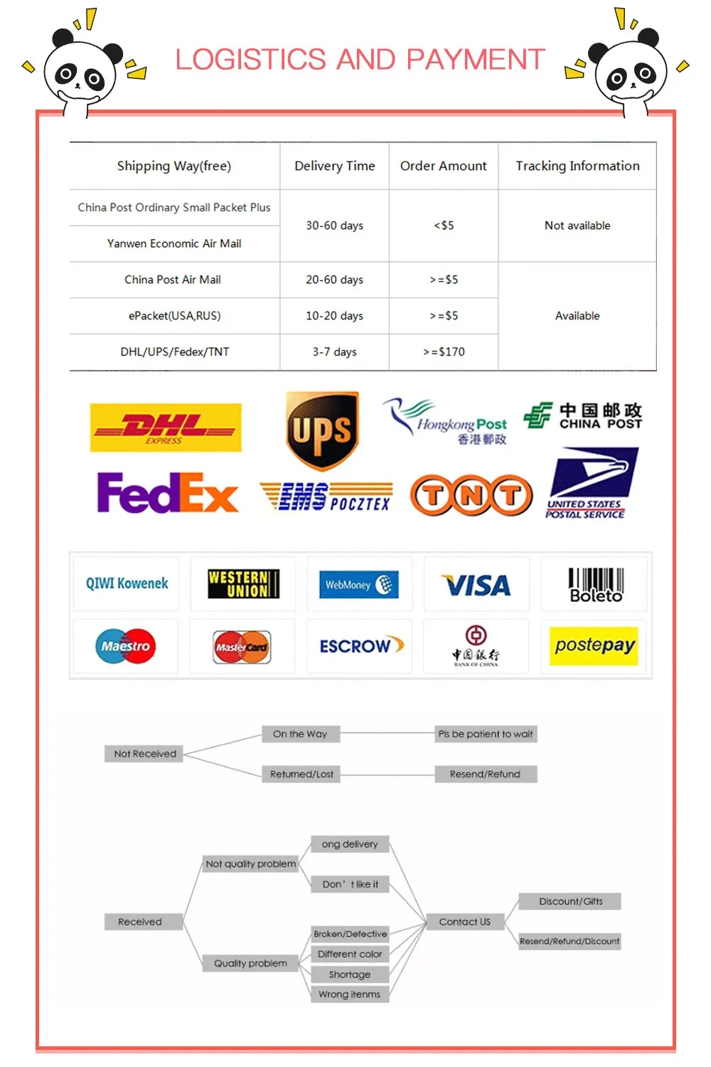 • If you did not receive the product within the guaranteed time( 45 days not including 2-5 day processing) you can request a refund or a reshipment.