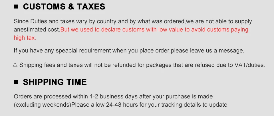We are not responsible for any custom fees once the items have shipped. By purchasing our products, you consent that one or more packages may be shipped to you and may get custom fees when they arrive in your country.