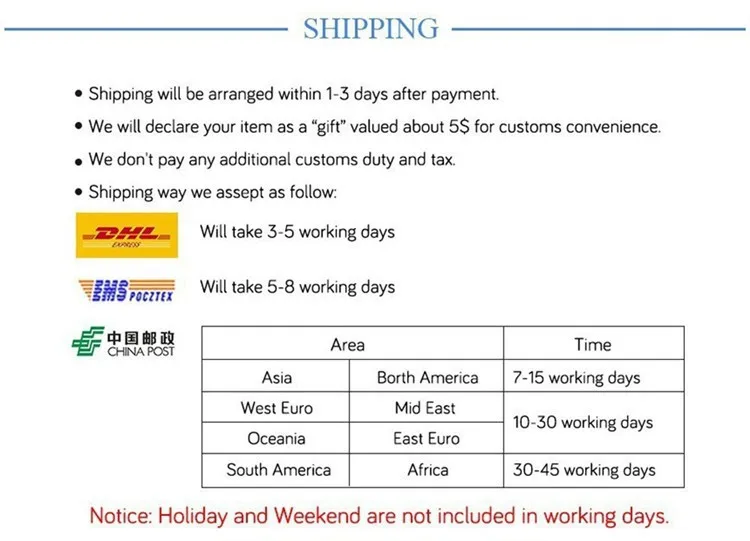 Packages from our warehouse in China will be shipped by ePacket or EMS depending on the weight and size of the product. Packages shipped from our US warehouse are shipped through USPS.