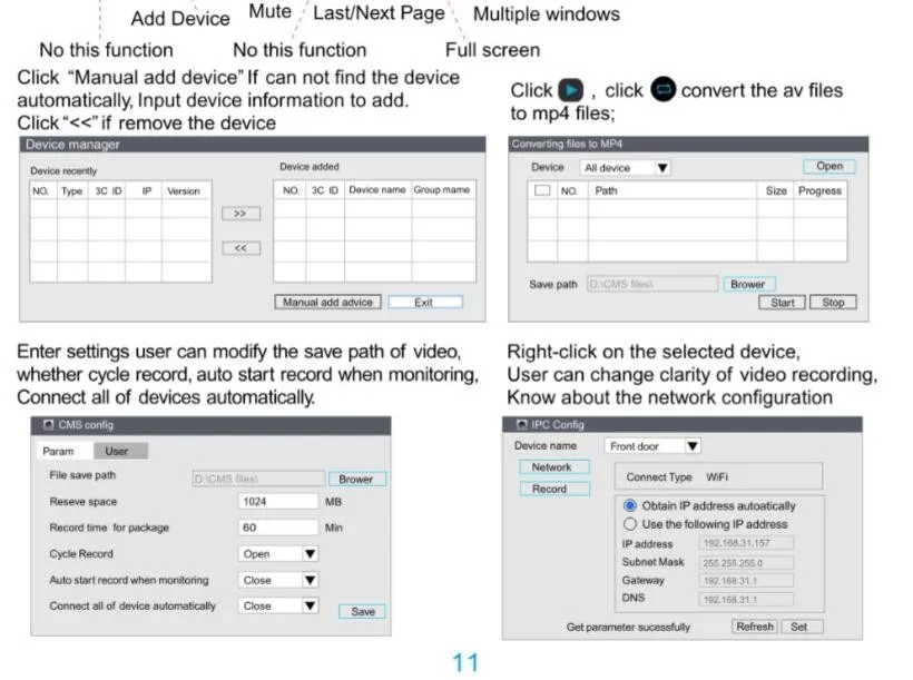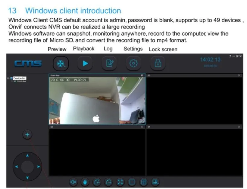 | Record mode | Manual Recording, Alarm Recording, Scheduled Recording |