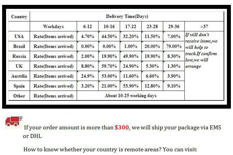 Packages from our warehouse in China will be shipped by ePacket or EMS depending on the weight and size of the product. Packages shipped from our US warehouse are shipped through USPS.