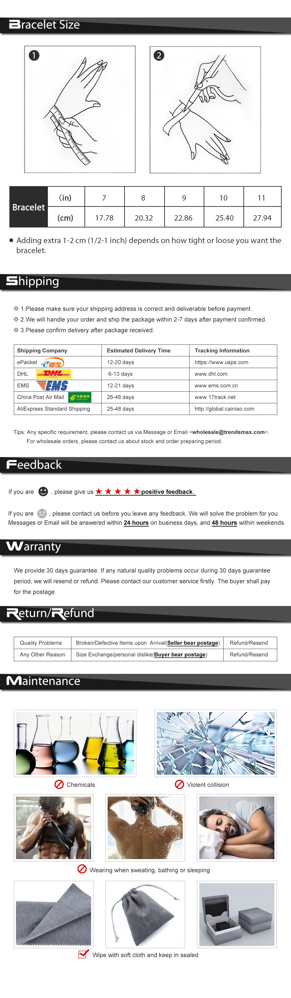 • If you did not receive the product within the guaranteed time( 45 days not including 2-5 day processing) you can request a refund or a reshipment.