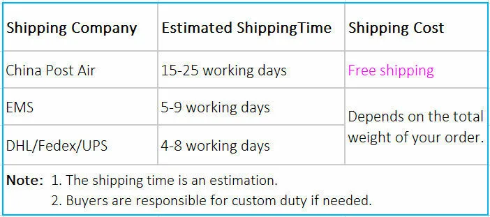 Packages from our warehouse in China will be shipped by ePacket or EMS depending on the weight and size of the product. Packages shipped from our US warehouse are shipped through USPS.