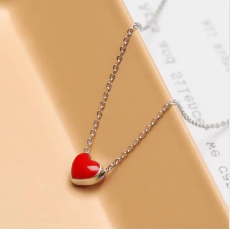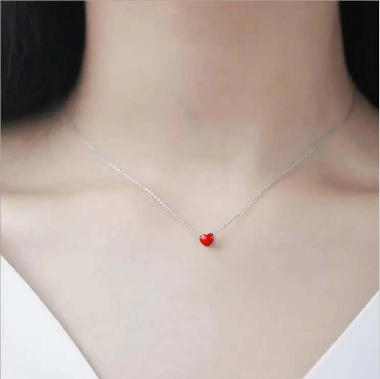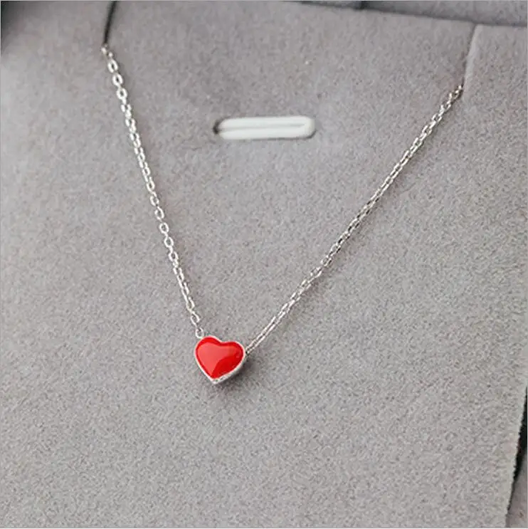 925 Sterling Silver Necklace Women Fashion Collier Cute Tiny Red Glaze Heart Pendant Necklace For Women Girls Lady Gifts