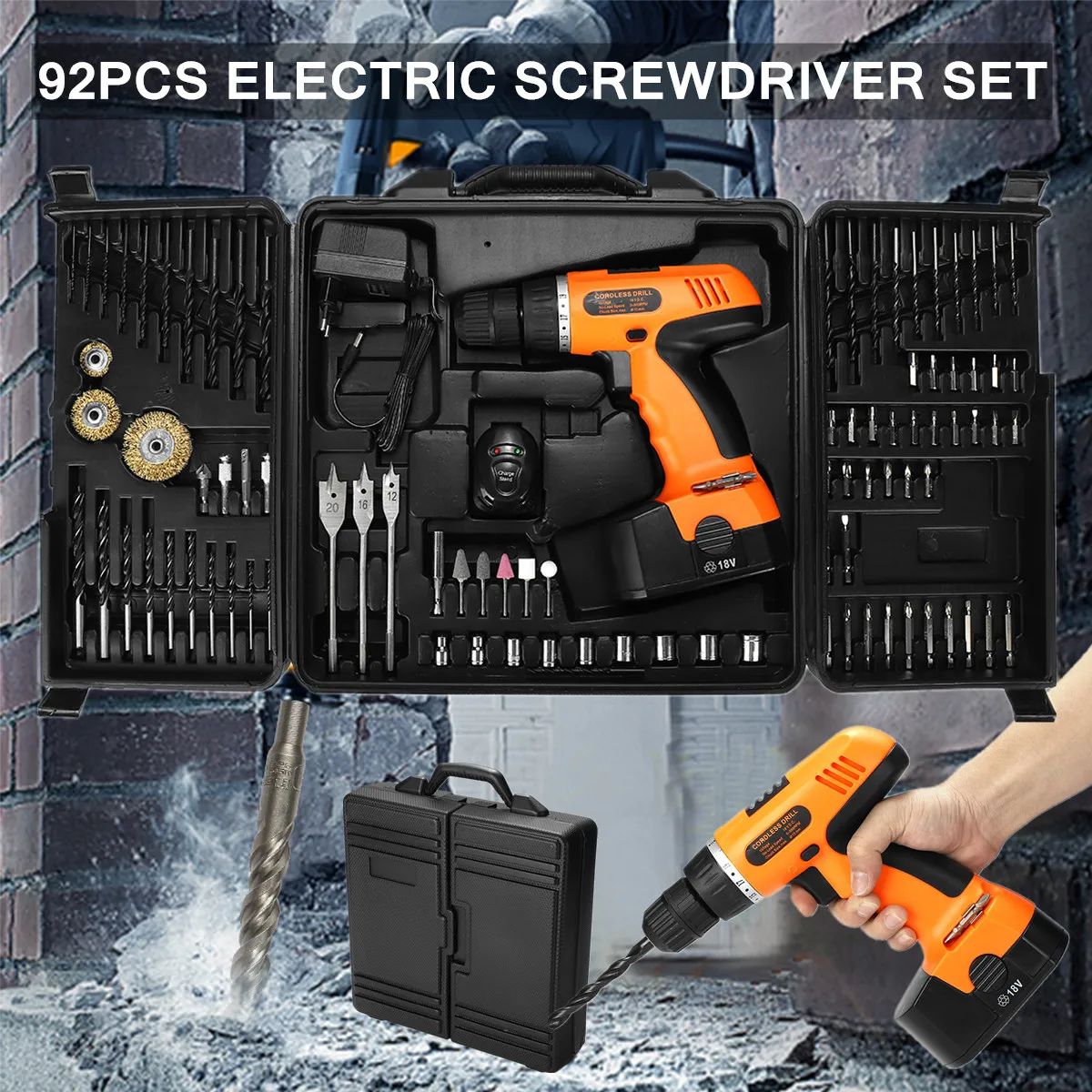 92Pcs Cordless Drill Accessory Set 18V Rechargeable Powered For DIY Repairs Carpentry Wood Metal 19-speed Double Tip Screwdriver