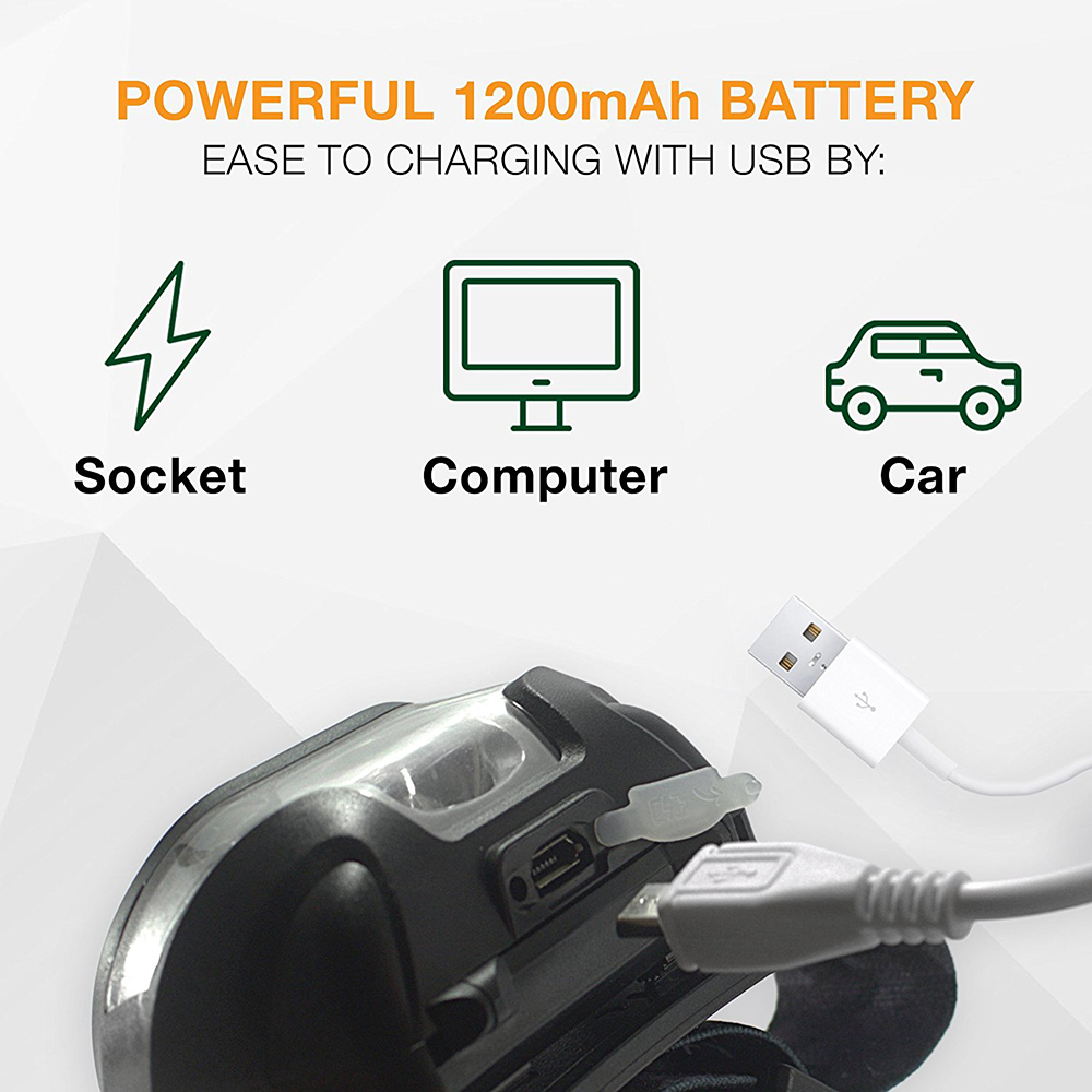 Don’t waste money on batteries! Affordable yet durable, the headlamp will last a minimum of 500 charge cycles.The headlight comes with a USB cable. With a maximum brightness of 160 Lumens, it can light up to 150 m ahead. The full beam is bright, and the flashing modes draw attention which might come in handy. The power capability is 4 hours for full brightness and 30 hours for economic brightness. The maximum charging time is 6 hours.