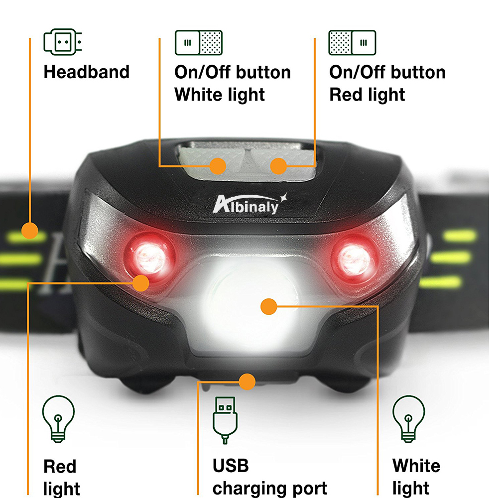 - 5 MODES The flashlight has two high beams: red and white, white low beam, flashing (strobe mode): red and white. There are two separate buttons for the red and white light, which mean you can combine the modes. For example, you can turn on the red flashing and white high beam simultaneously. The head torch has an adjustable light angle of up to 45 degrees which can be adjusted with an easy up or down motion.