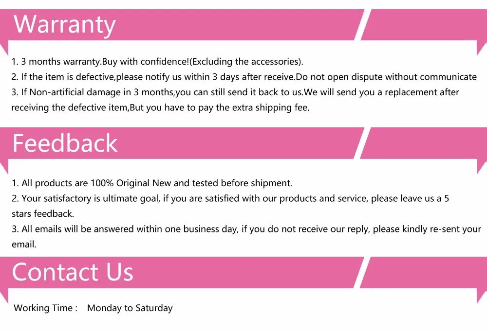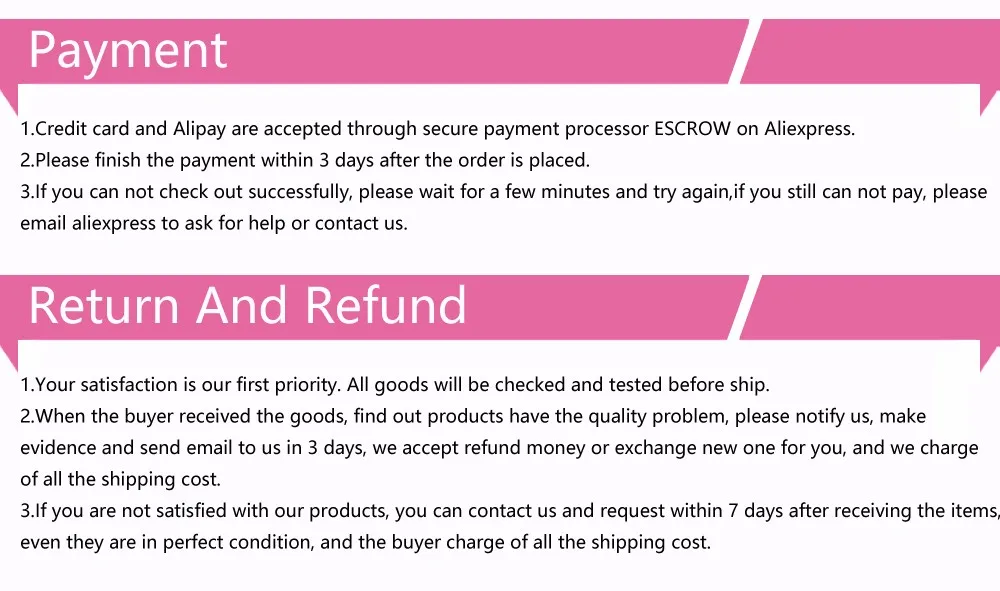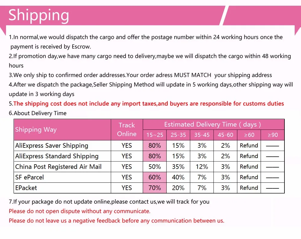 • If you did not receive the product within the guaranteed time( 45 days not including 2-5 day processing) you can request a refund or a reshipment.