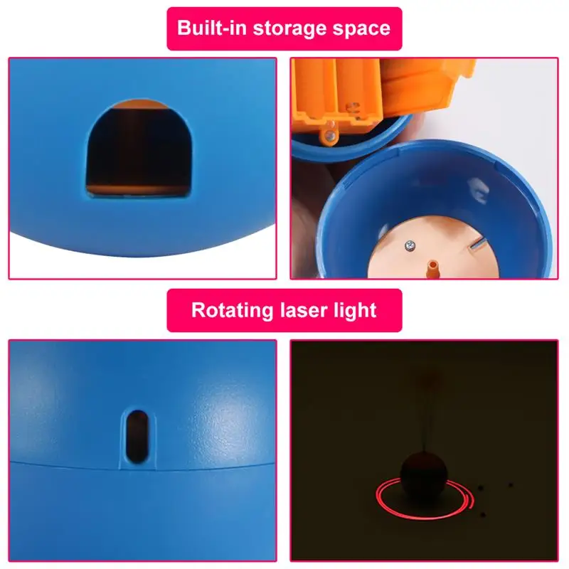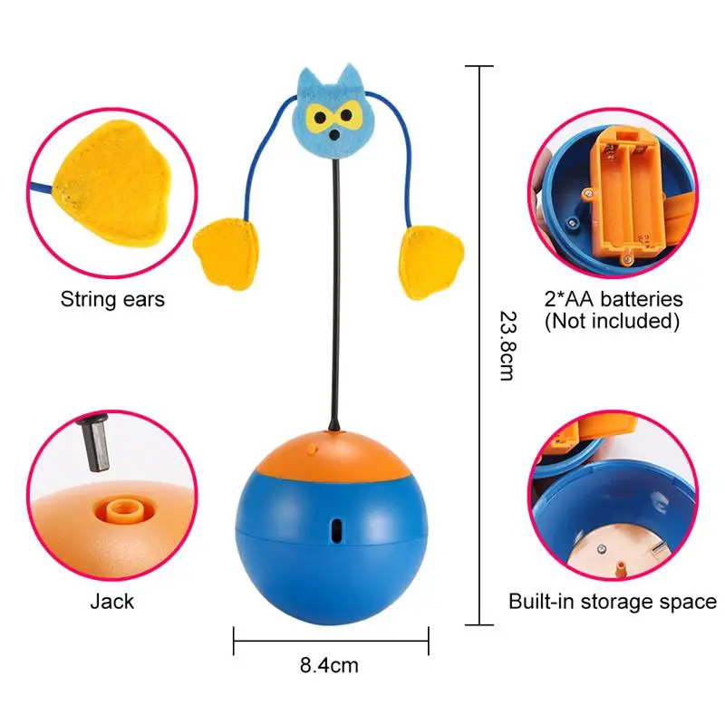Ball shaped Tumbler, Red Light, Food Dispenser, all three features are built in one toy. And you can get all 3 features within one purchase, great value and worth every penny you spend. The ball tumbler will automatic spinning on the floor while shooting out red light, also leaking out food simultaneously.
