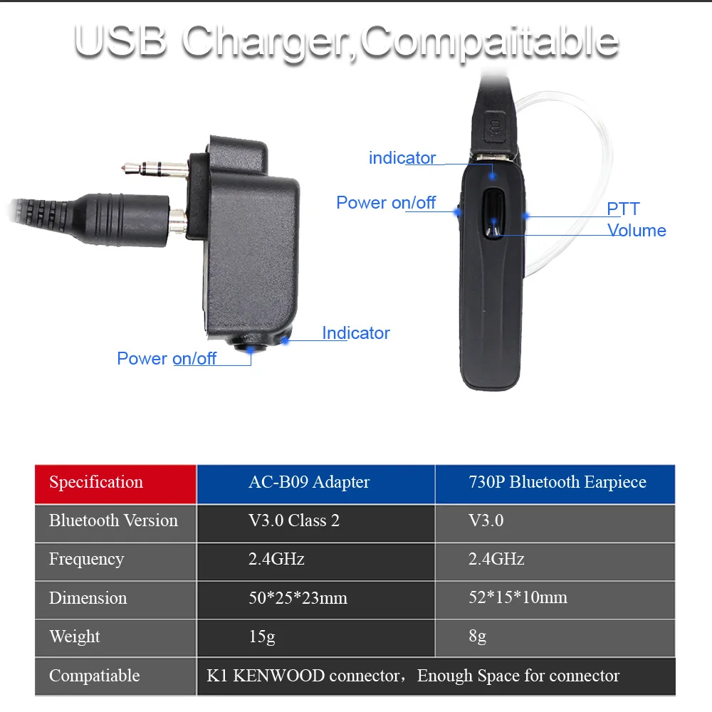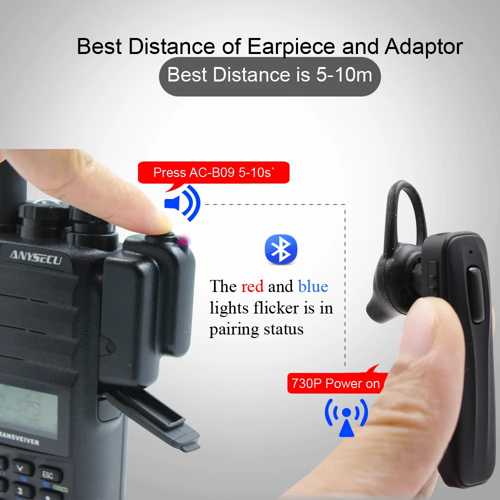 The ANYSECU AC-B09 hands-free including AC-B09D Bluetooth dongle and AC-B09E Bluetooth earpiece. AC-B09E is a swivel earpiece which built in PTT microphone that can be placed over either ear.