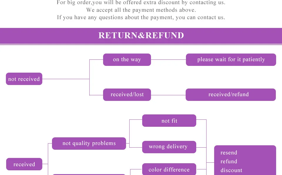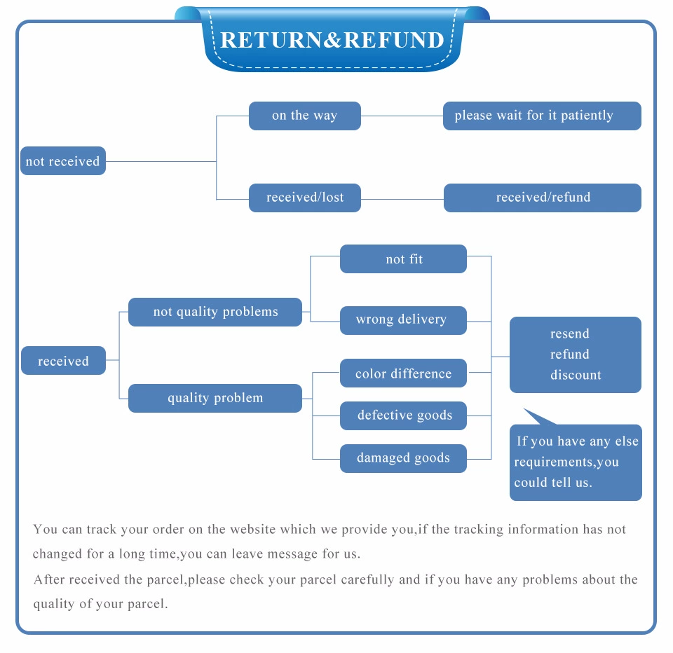 • If you did not receive the product within the guaranteed time( 45 days not including 2-5 day processing) you can request a refund or a reshipment.