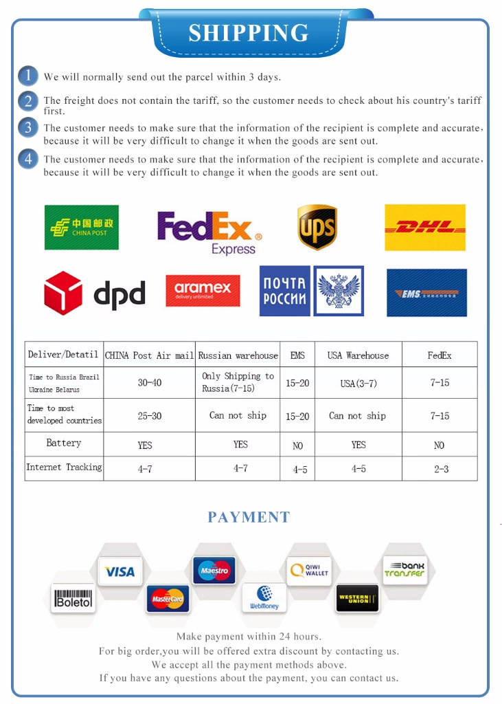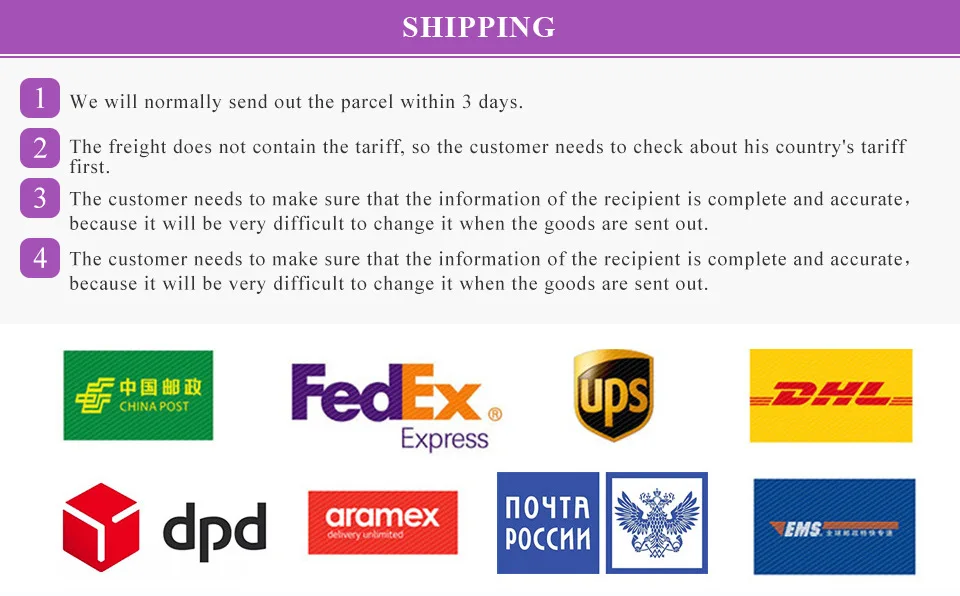 Packages from our warehouse in China will be shipped by ePacket or EMS depending on the weight and size of the product. Packages shipped from our US warehouse are shipped through USPS.