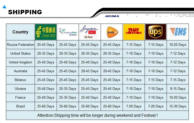 Packages from our warehouse in China will be shipped by ePacket or EMS depending on the weight and size of the product. Packages shipped from our US warehouse are shipped through USPS.