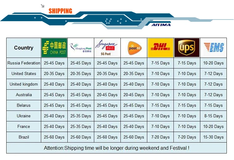Packages from our warehouse in China will be shipped by ePacket or EMS depending on the weight and size of the product. Packages shipped from our US warehouse are shipped through USPS.
