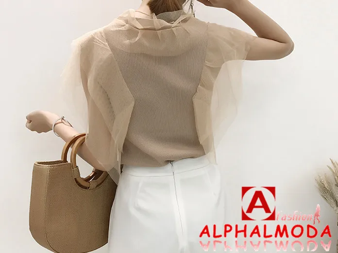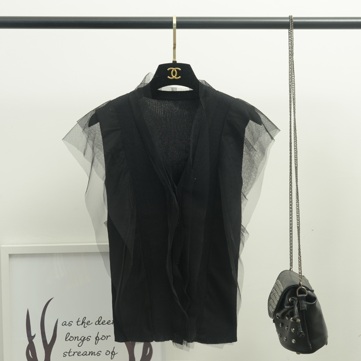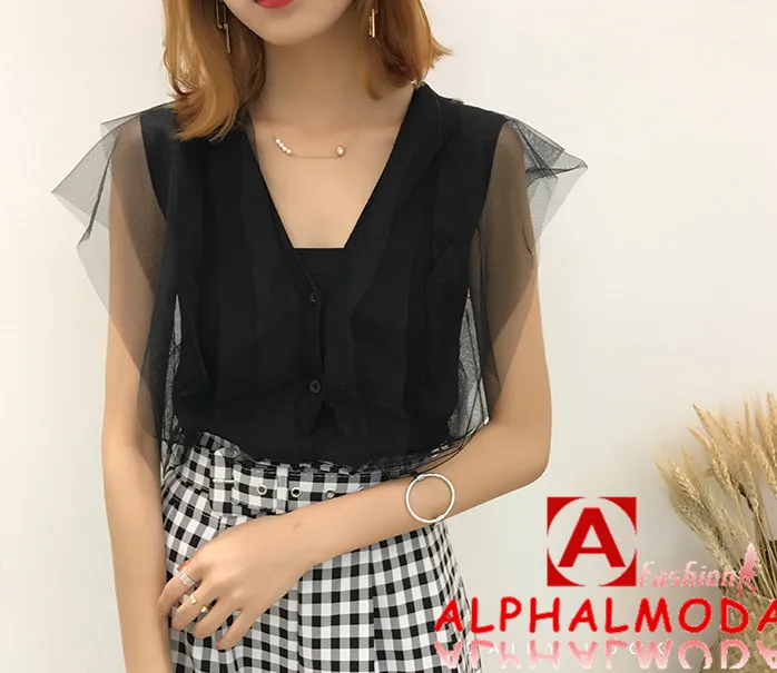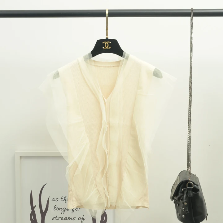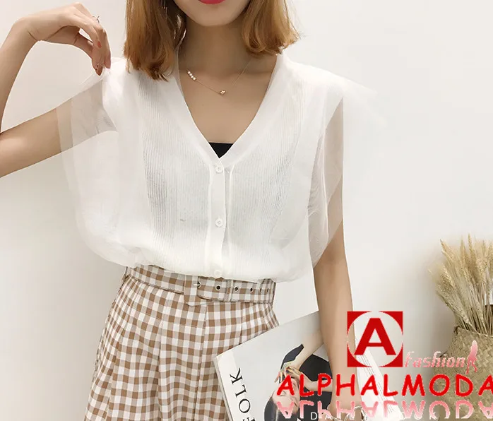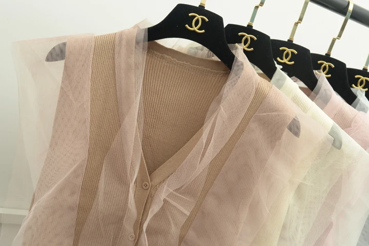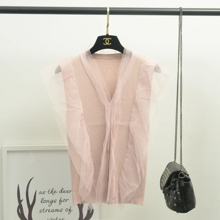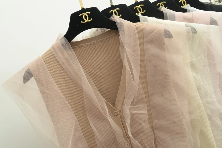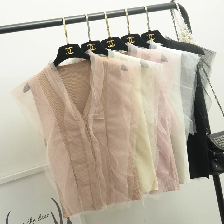 [Alphalmoda] 2017 Summer Korean Fashion Gauze Patchwork V Collar Women’s Graceful Sleeveless Sweater Cardigans Single Breasted