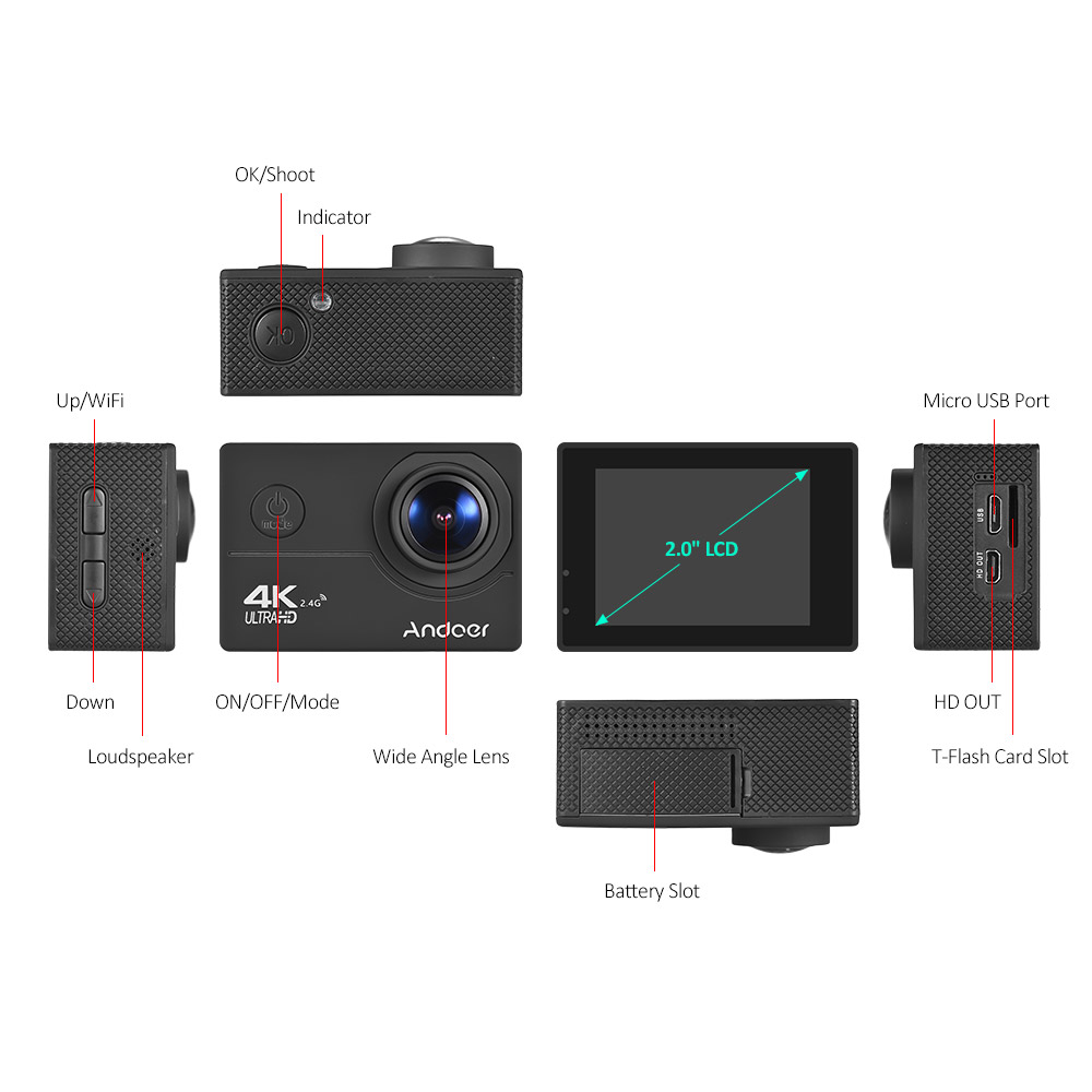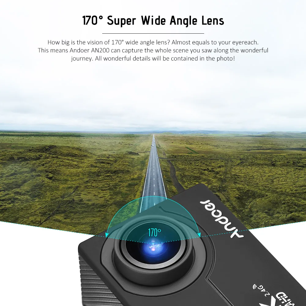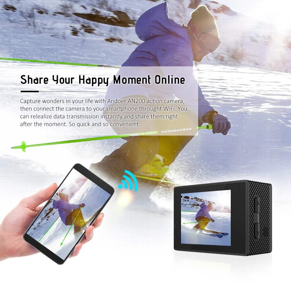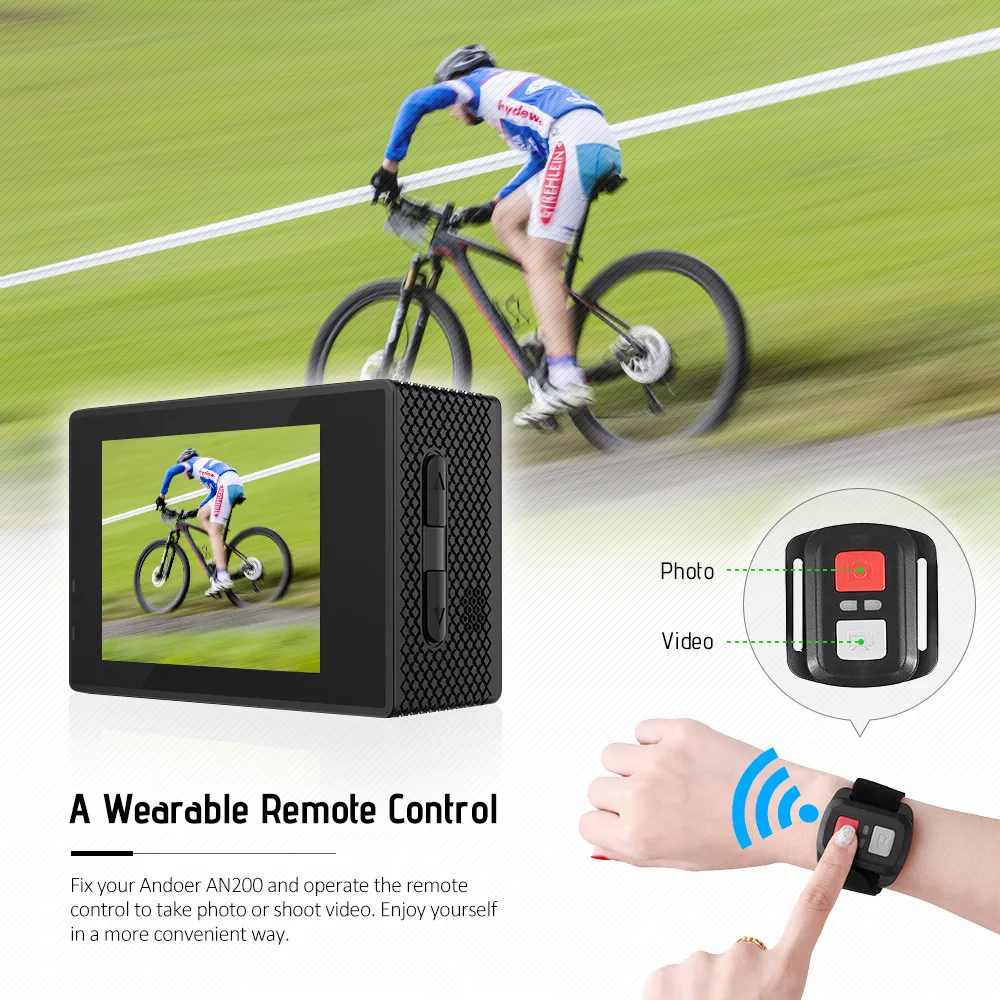 4K ultra HD video, 16MP high definition photo, 170° super wide angle lens, 40m deep waterproof housing, wearable remote – enjoy your shooting with Andoer AN200 action camera! There are time lapse/slow motion/drama shot & etc modes for you to better enjoy yourself! WiFi function enables you to share happy moment instantly!