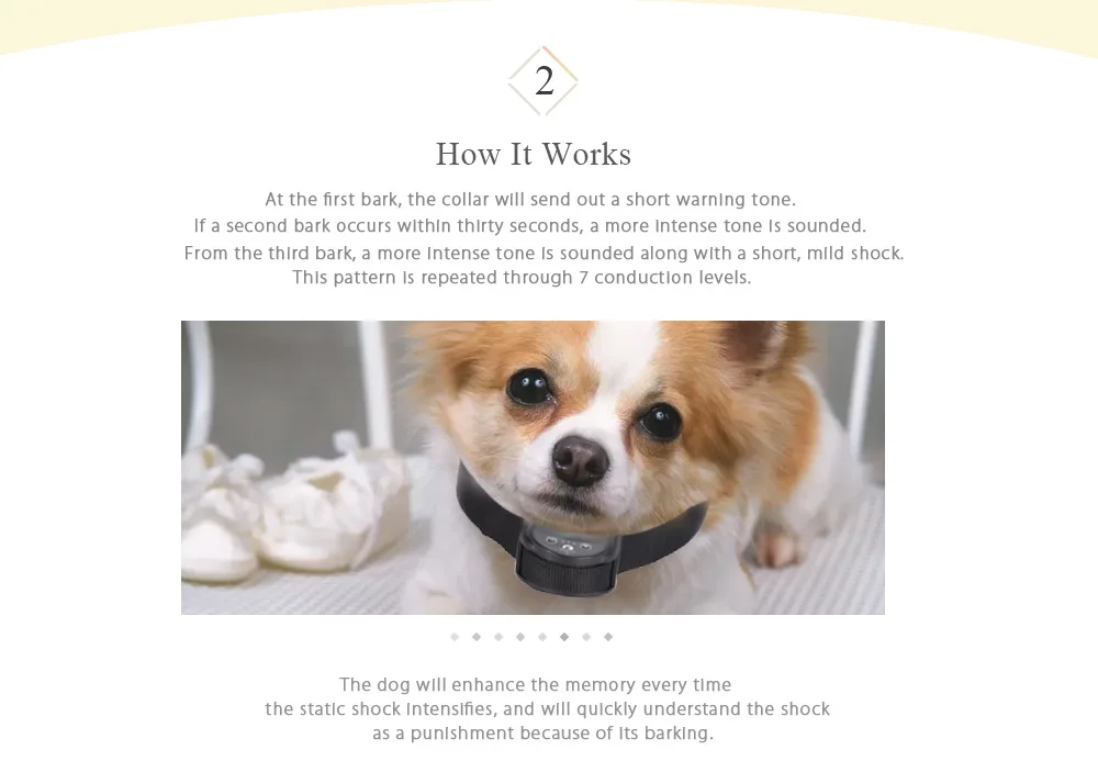 1. At the first bark, the collar will send out a short warning tone. If a second bark occurs within thirty seconds, a more intense tone is sounded. From the third bark, a more intense tone is sounded along with a short, mild shock. This pattern is repeated through 7 conduction levels.