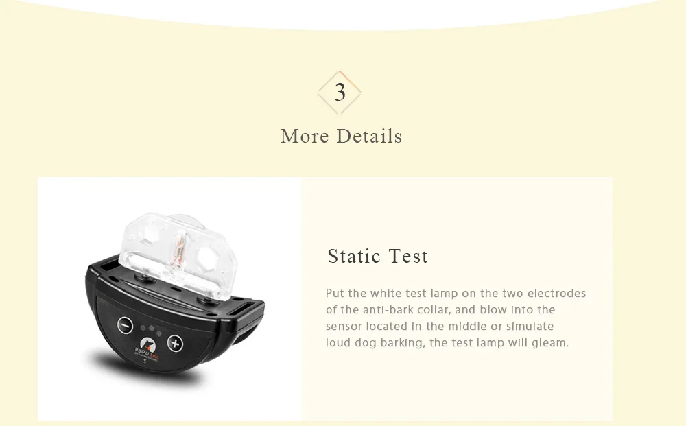 2. If your dog continues to bark, the more intense sound and shock will send out until your dog stops for thirty seconds, and then it will automatically reset to the first ” tone only ” level. If the collar reaches the 7 level, the collar will stop working for 1 minute to protect your dog.