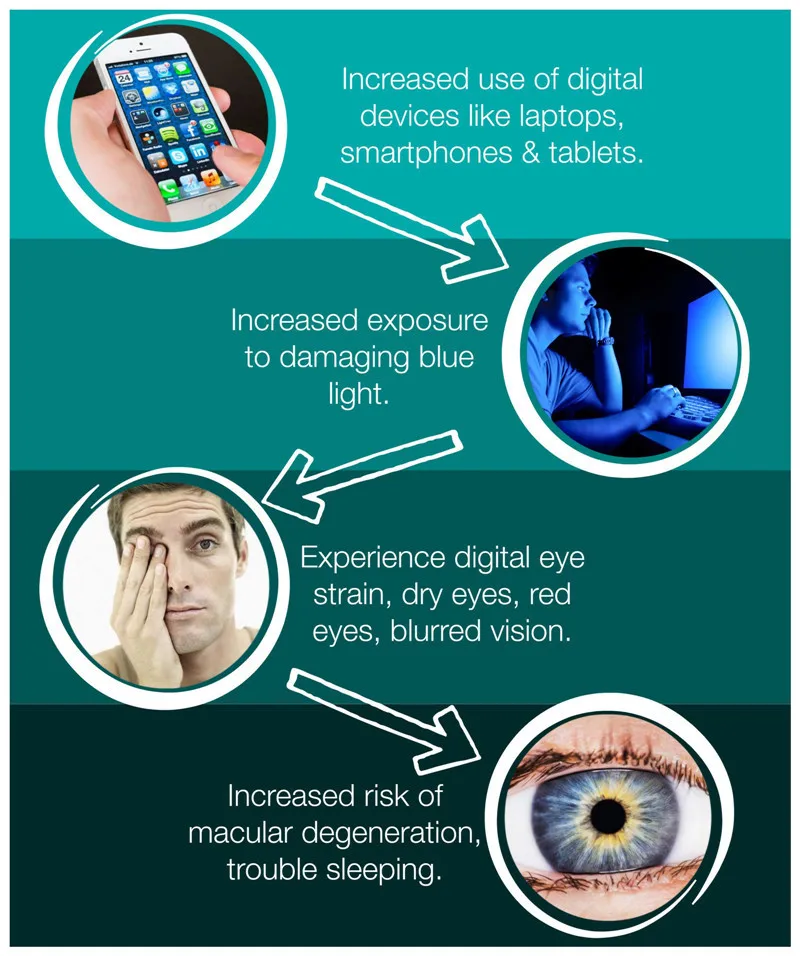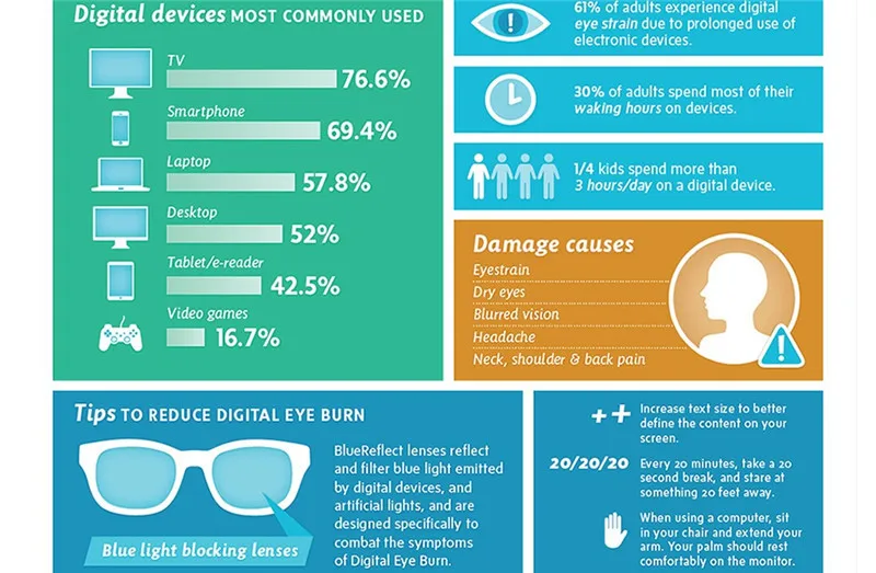 Vision problems are unfortunately one of the hazards of too much screen time. In fact, the Vision Council found that 70 percent of US adults in one survey reported having some kind of digital eye strain (strained, dry, or red eyes; blurred vision; headaches; back pain; neck pain; or general fatigue) as a result of using digital devices for hours at a time.