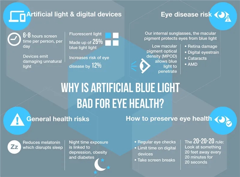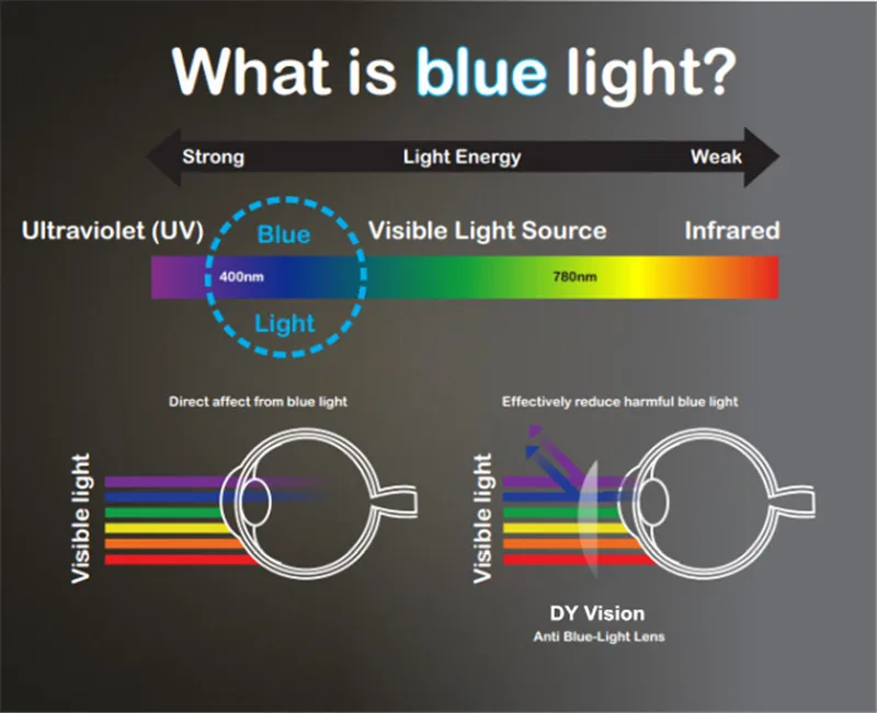 While many are aware of how blue light from electronics disrupts sleep, many do not know that about 25% of the blue light from fluorescent lighting and 35% from LED lights is also damaging to eye health, over time raising the risk of vision problems including macular degeneration. The degeneration is pretty subtle and minimum but why take any risks? Due to this fact eye strain is also eliminated.