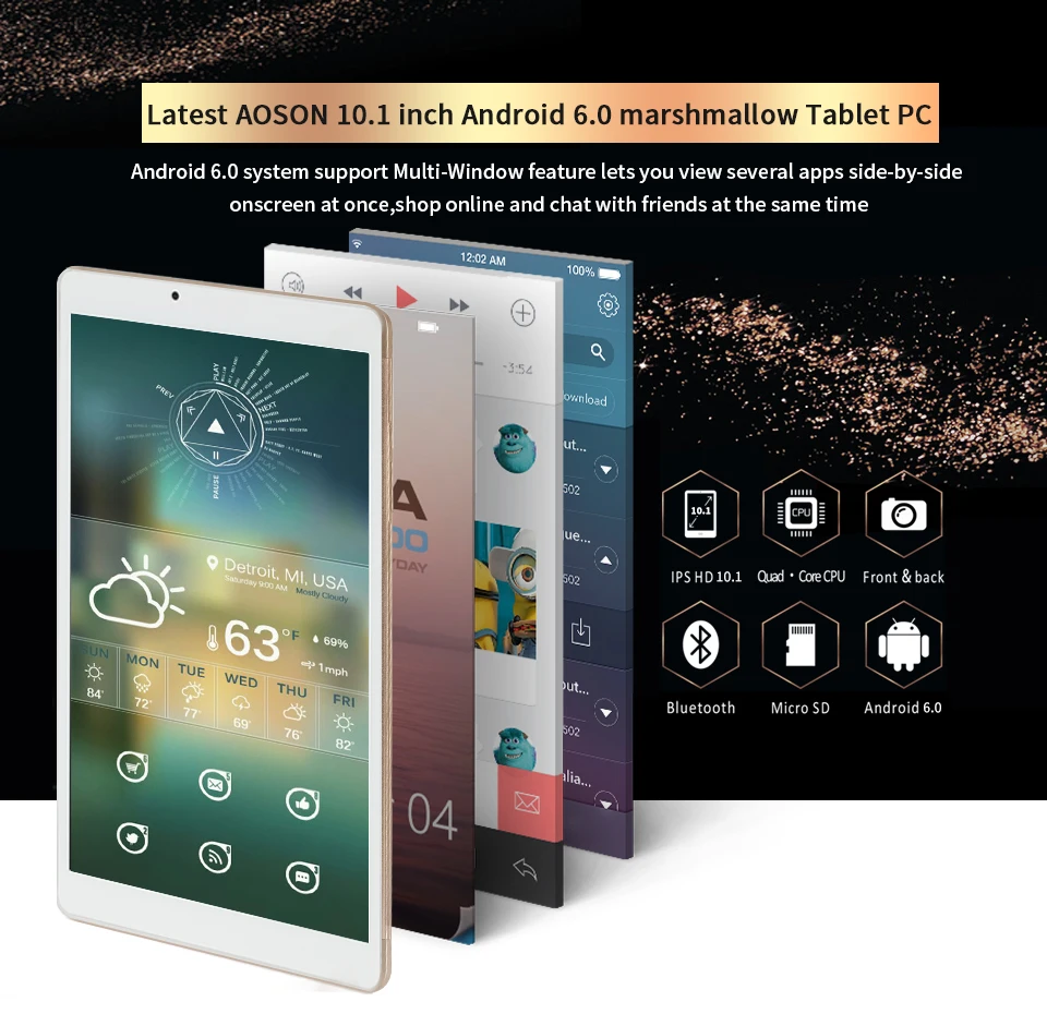 AOSON 10.1 inch 1/2GB+16/32GB Android 6.0 Quad Core Tablets pc 800*1280 IPS Dual Cameras Bluetooth WIFI 5000mAh Hot sale Tablets