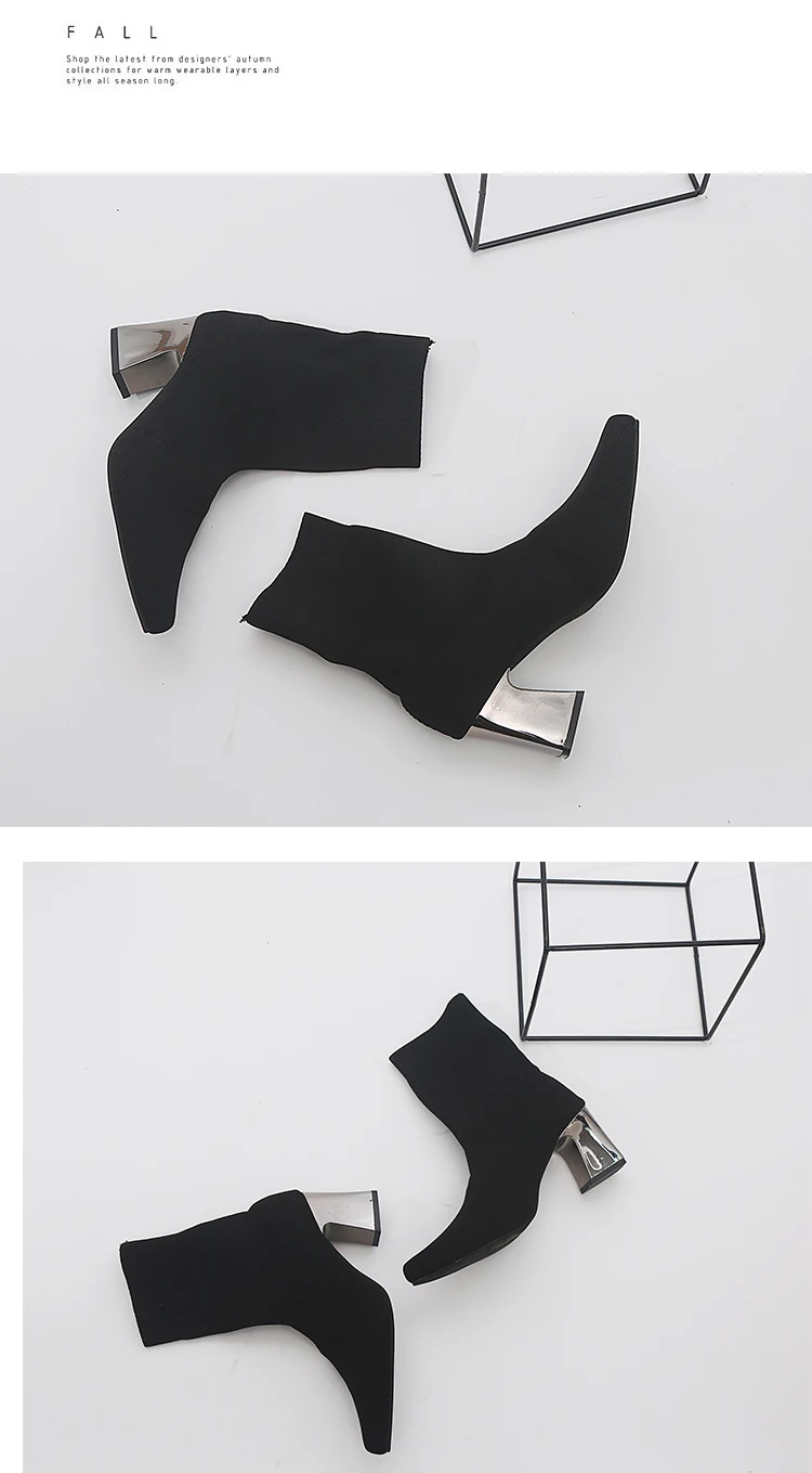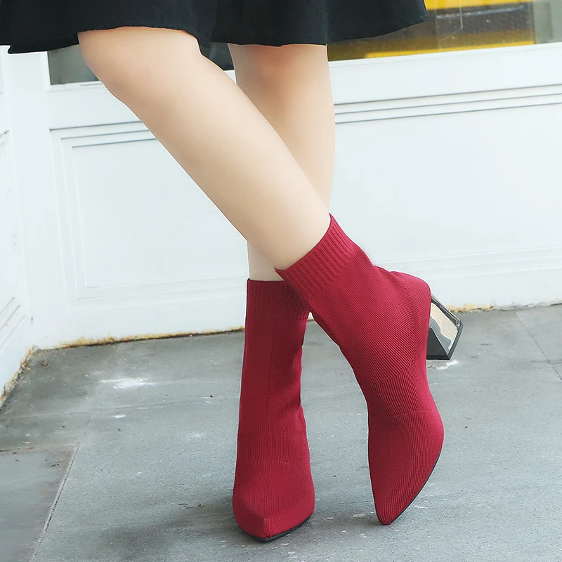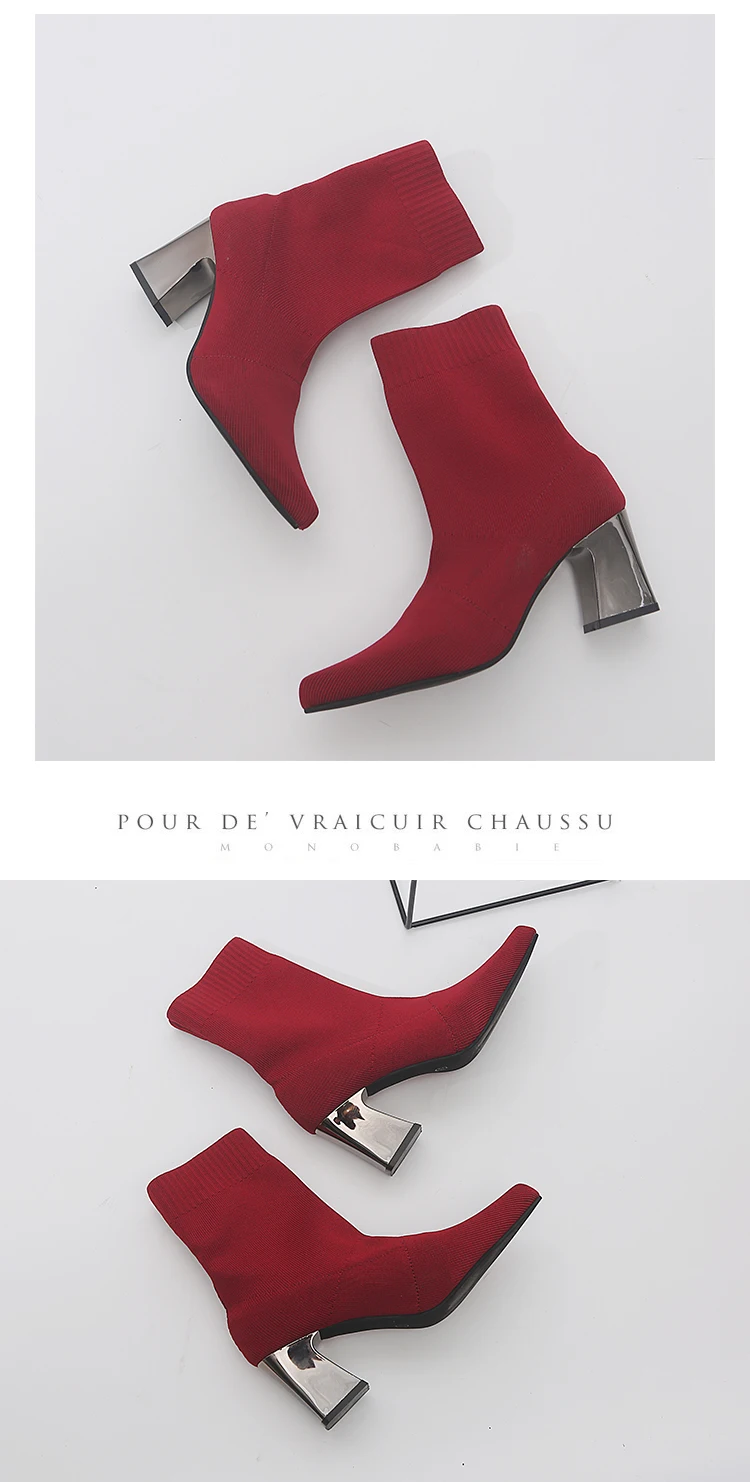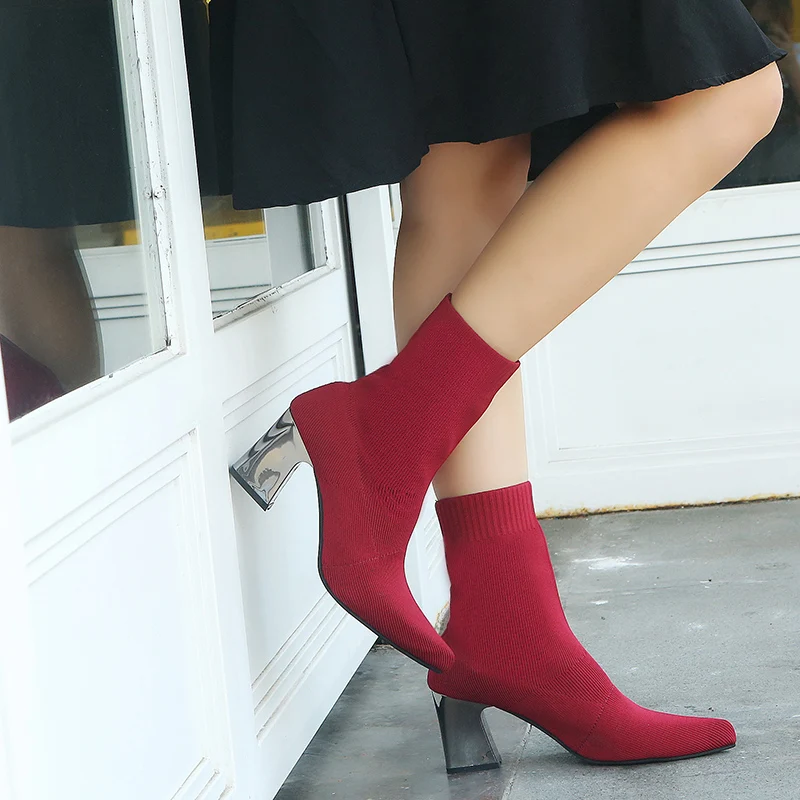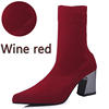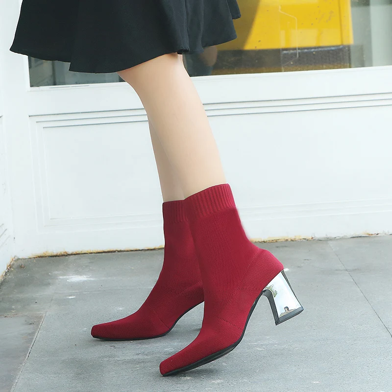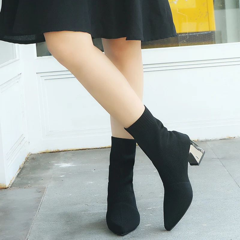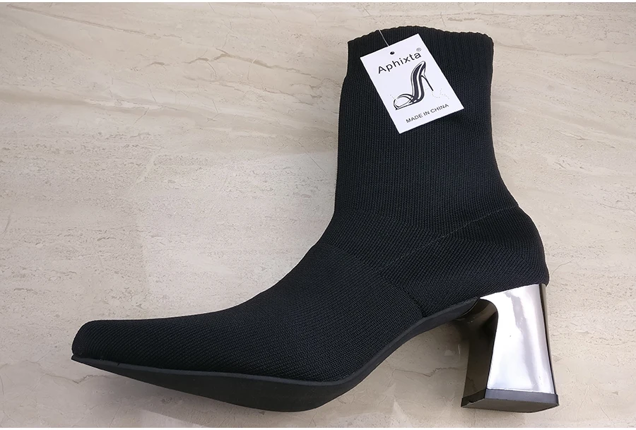 Aphixta Sock Boots Women Shoes Elastic Boots Cloth Mid-Calf Stretch Knit Bootie Socks Square Heel Ladies Shoes Plus Size 43