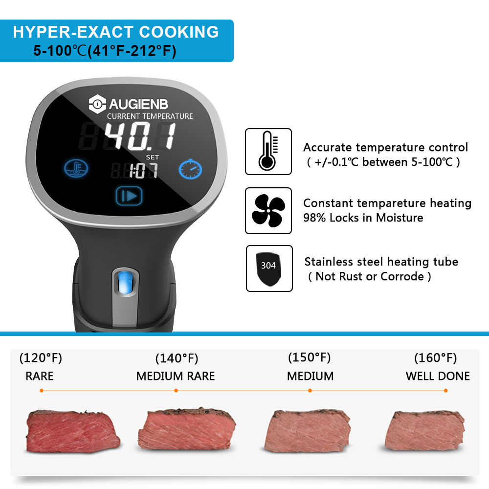 ✔Tools for a New Lifestyle — AUGIENB Sous Vide Cooker brings professional restaurant cooking technology to home, which cooked any type of meat—beef, pork, lamb, or poultry, especially well with fish and seafood, any vegetable, eggs, many fruits and desserts. Remains food’s nutrient, keeps vitamins levels of food at 90% after cooking.