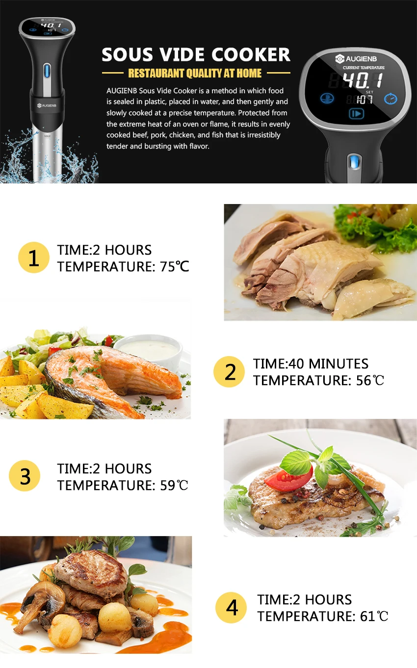 ✔Tools for a New Lifestyle — AUGIENB Sous Vide Cooker brings professional restaurant cooking technology to home, which cooked any type of meat—beef, pork, lamb, or poultry, especially well with fish and seafood, any vegetable, eggs, many fruits and desserts. Remains food’s nutrient, keeps vitamins levels of food at 90% after cooking.