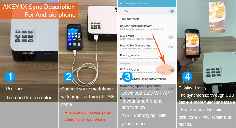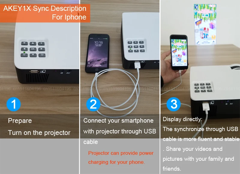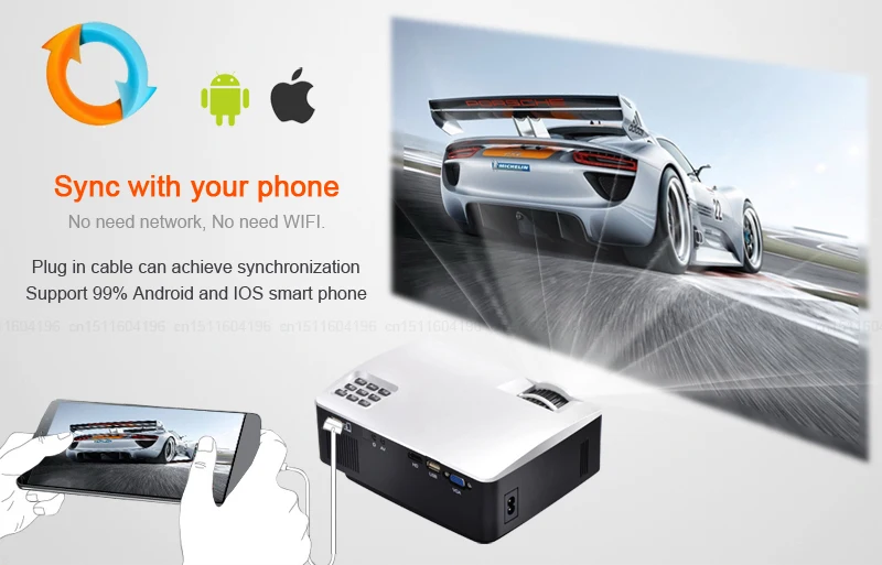 * Support Synchronize projector with smartphone through USB cable. (IOS phone no need app, plug and display)