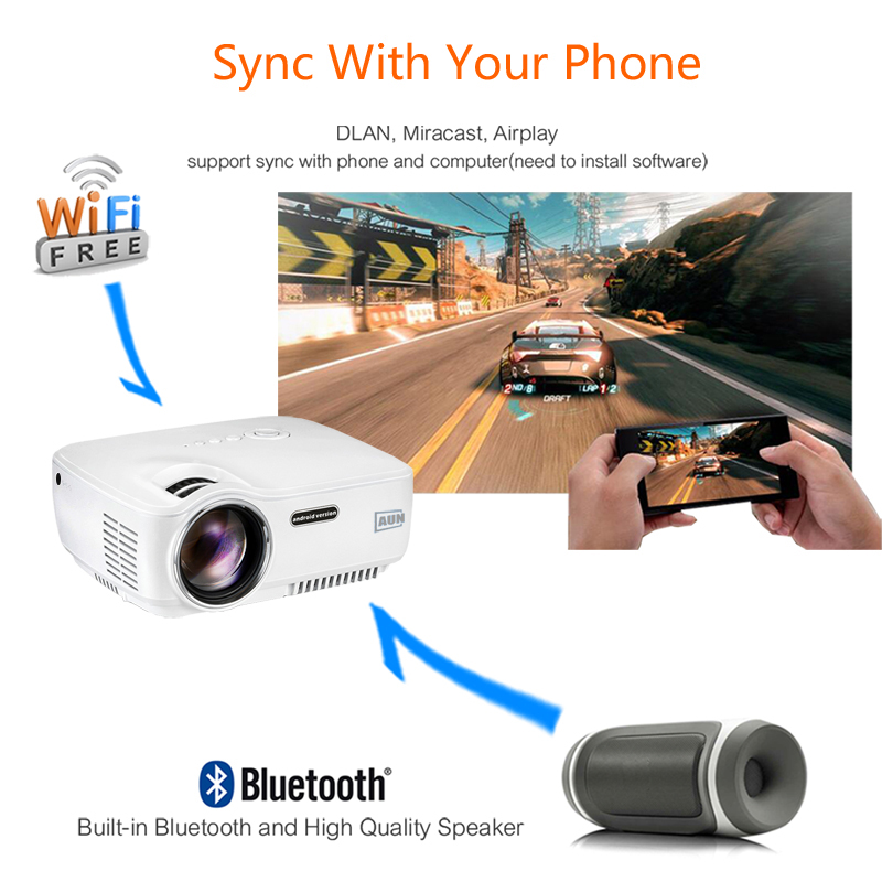 WIFI: yes. Support sync phone screen to projector through WIFI Bluetooth: Bluetooth 4.0. Support bluetooth speaker through Bluetooth |