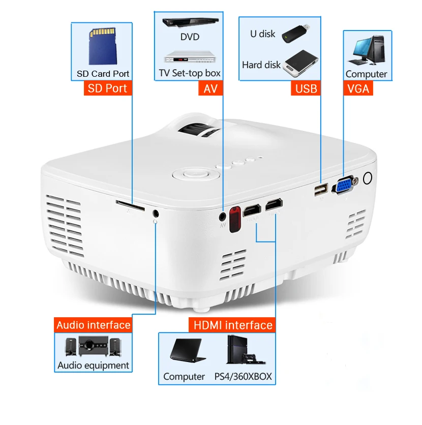input: HDMI, USB, AV, SD Card, VGA, Support connect TV BOX, Smartphone, computer, USB flash disk, DVD Play, DV, Xbox, PS4, and so on. output: 3.5 mm Earphone |