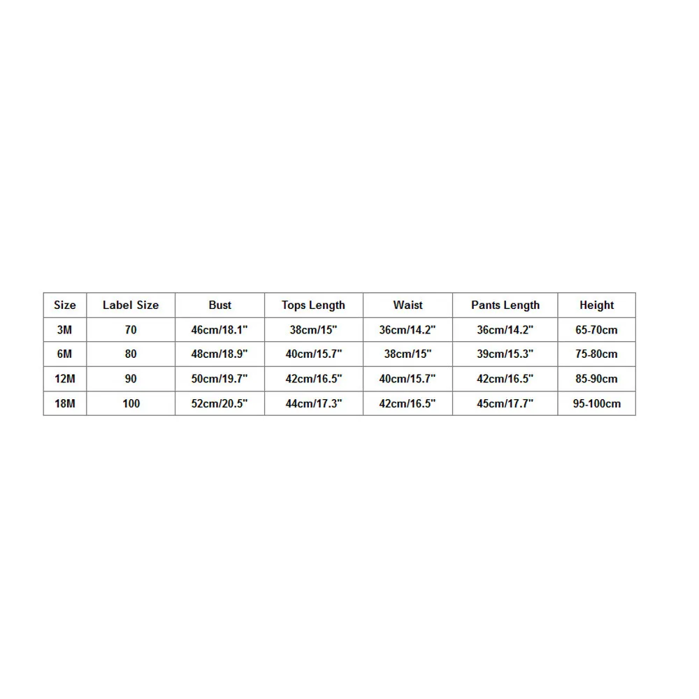 Size Label Size Bust Tops Length Waist Pants Length Height 3M 70 46cm/18.1″ 38cm/15″ 36cm/14.2″ 36cm/14.2″ 65-70cm 6M 80 48cm/18.9″ 40cm/15.7″ 38cm/15″ 39cm/15.3″ 75-80cm 12M 90 50cm/19.7″ 42cm/16.5″ 40cm/15.7″ 42cm/16.5″ 85-90cm 18M 100 52cm/20.5″ 44cm/17.3″ 42cm/16.5″ 45cm/17.7″ 95-100cm ![]()