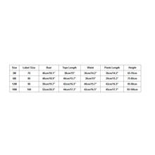 Size Label Size Bust Tops Length Waist Pants Length Height 3M 70 46cm/18.1″ 38cm/15″ 36cm/14.2″ 36cm/14.2″ 65-70cm 6M 80 48cm/18.9″ 40cm/15.7″ 38cm/15″ 39cm/15.3″ 75-80cm 12M 90 50cm/19.7″ 42cm/16.5″ 40cm/15.7″ 42cm/16.5″ 85-90cm 18M 100 52cm/20.5″ 44cm/17.3″ 42cm/16.5″ 45cm/17.7″ 95-100cm ![]()