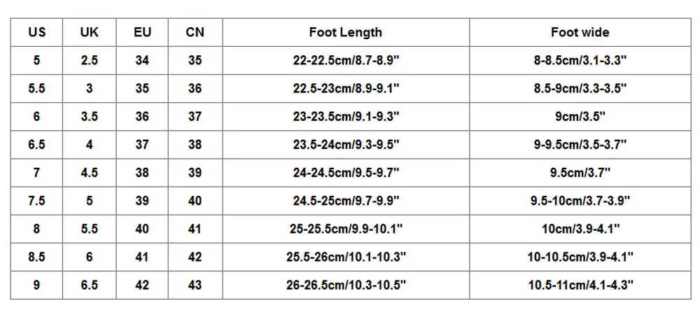 US UK EU CN Foot Length Foot wide