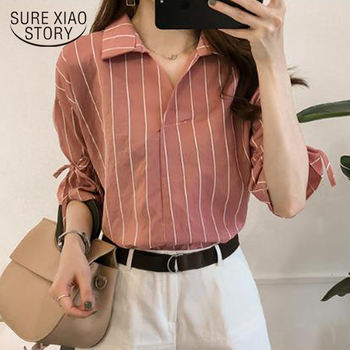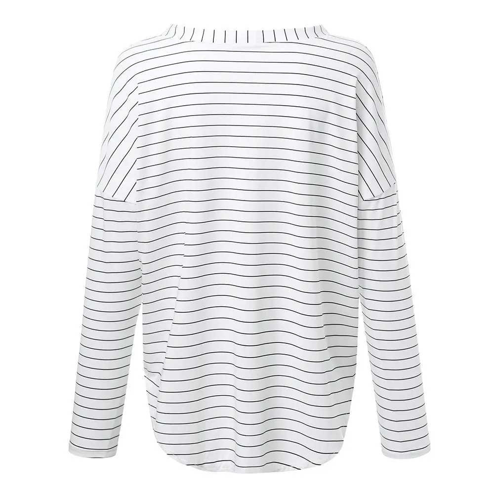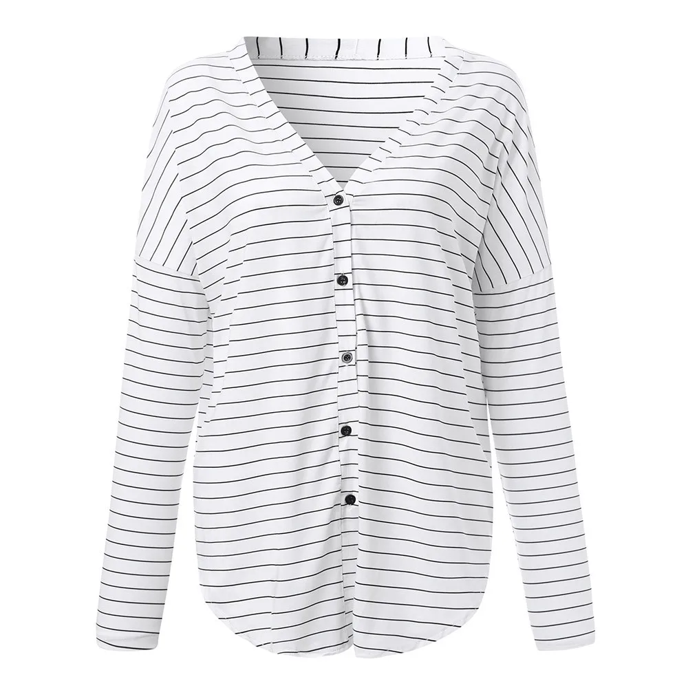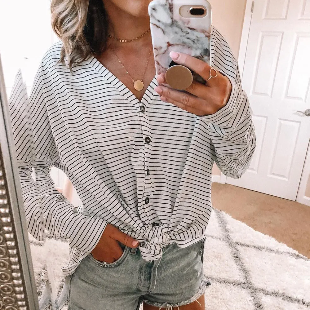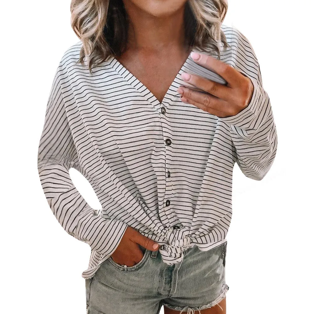 Autumn New Fashion Women Ladies Blouse Long Sleeve Casual Open Front Striped Printed V-Neck Long Sleeved Loose Top Blouse Femme