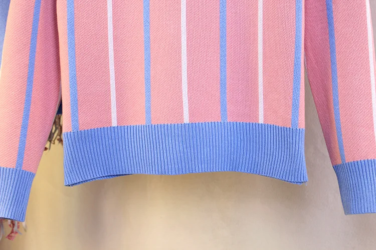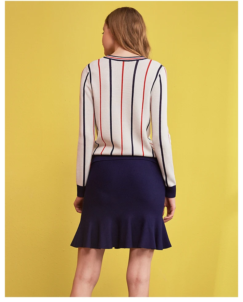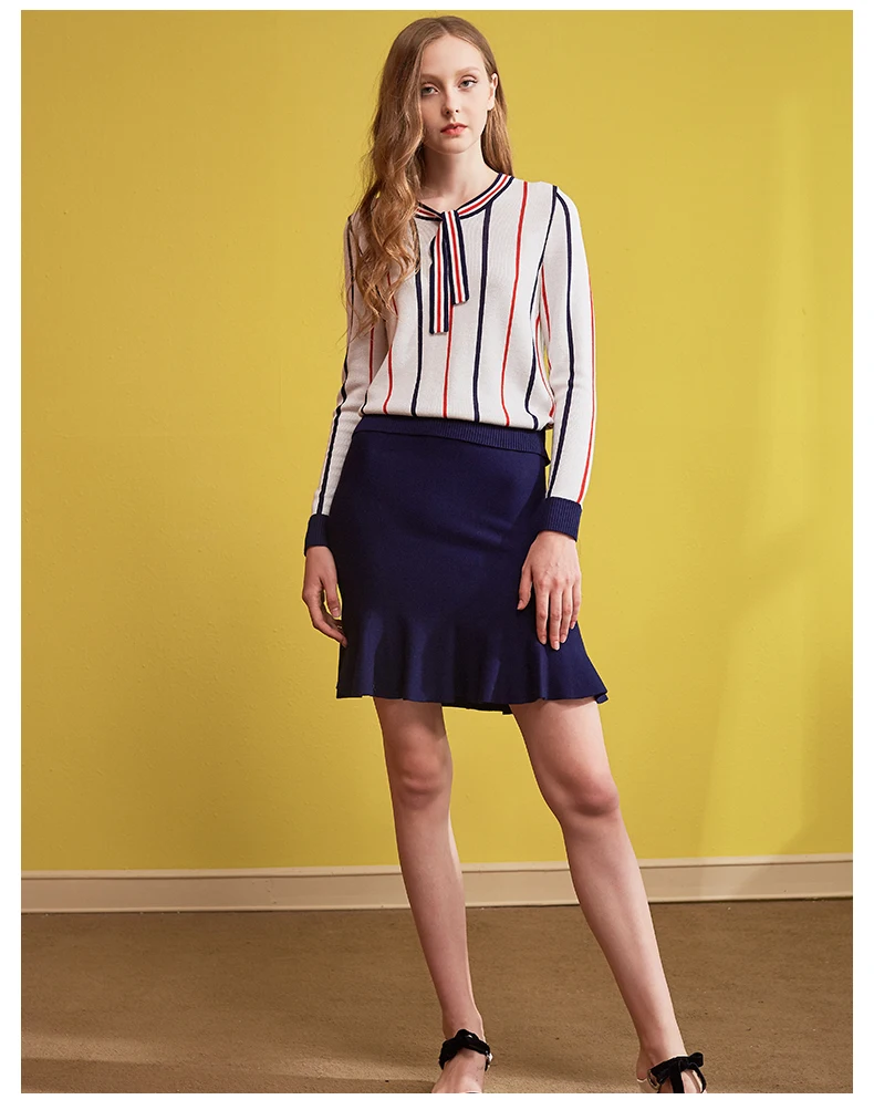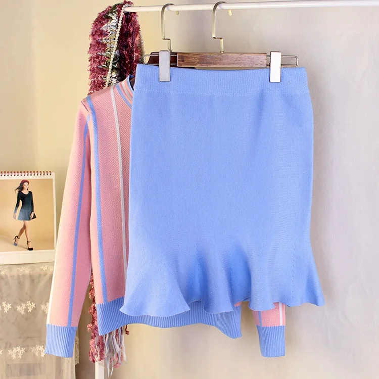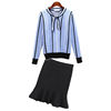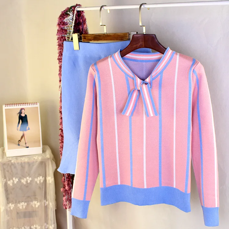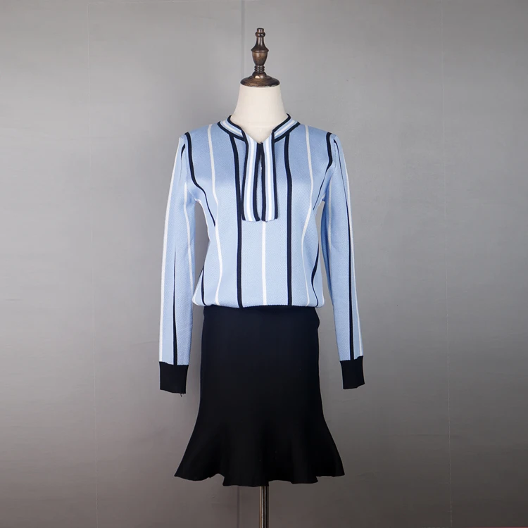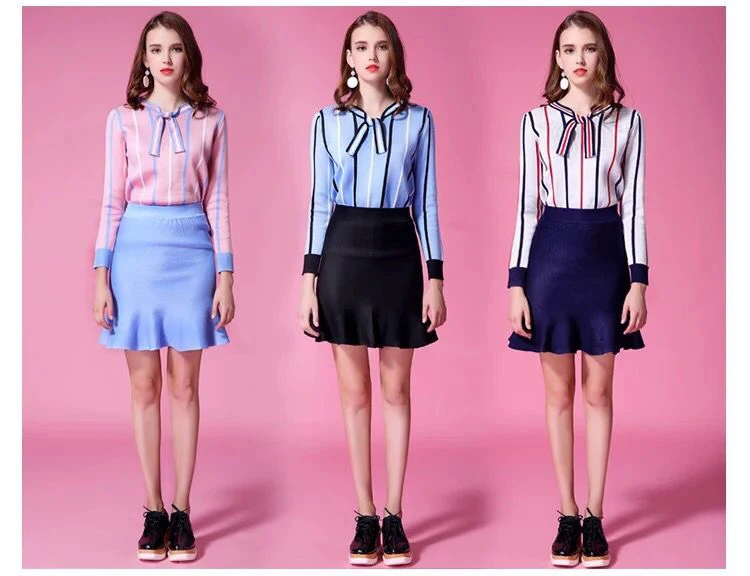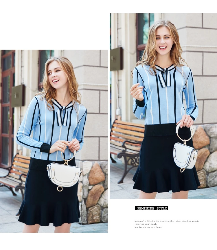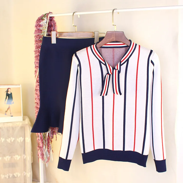Autumn Spring Women’s Clothing Sets Butterfly Collar Strip Sweaters Knit Tops Mermaid Work Office Skirts Suit Elegant Set NS198