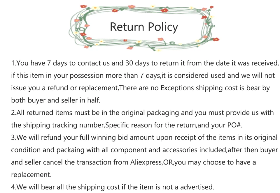 • If you do not want the product you’ve received you may request a refund but you must return the item at your expense and the item must be unused.