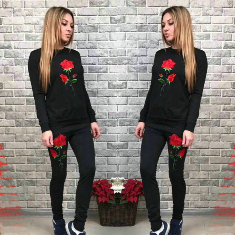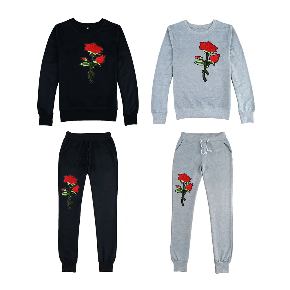 Autumn Winter Two-piece Tracksuit Jogging Suits For Women Sport Suits With Rose Flower Embroidery Running Sweat Pants Sportswear