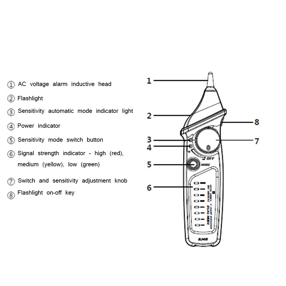 7. NCV signal strength indication mode: Through alarm sounds of different frequency and LED lights of different colors to indicate the signal intensity,high (red), medium (yellow), low (green).