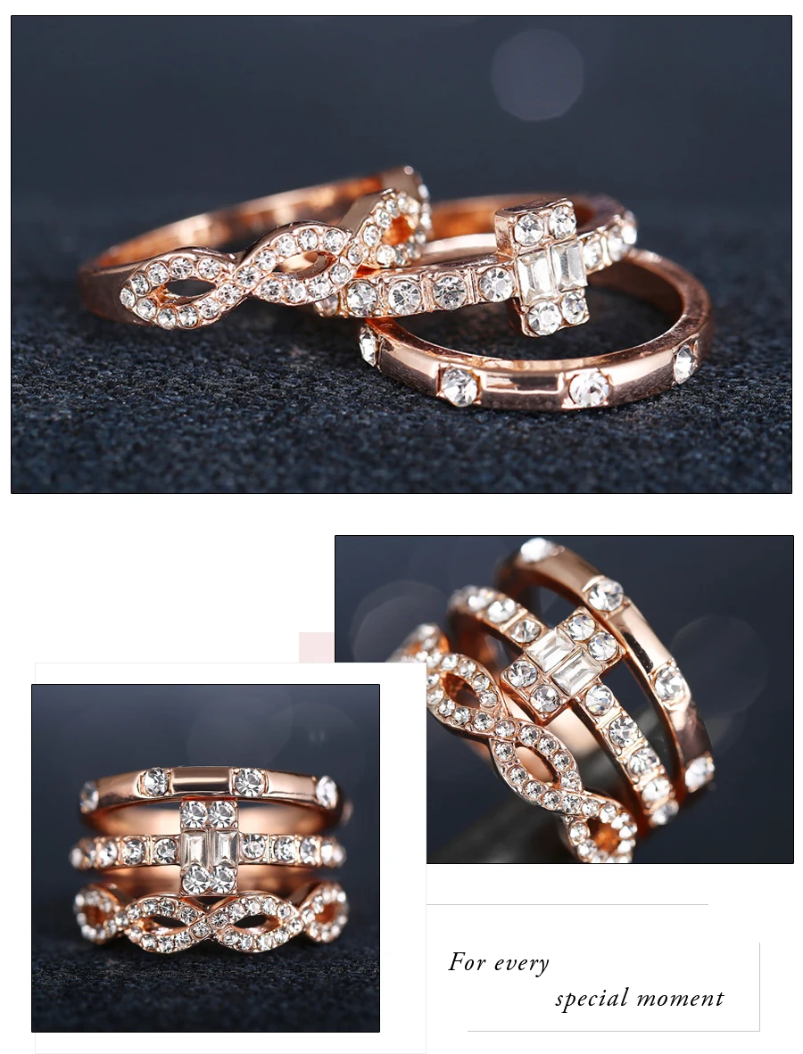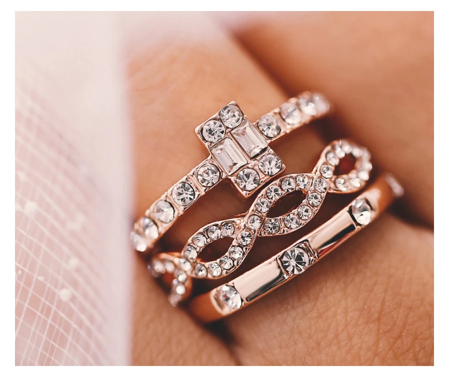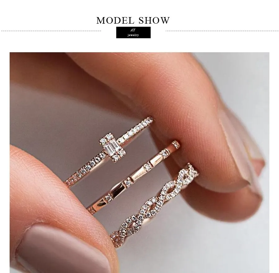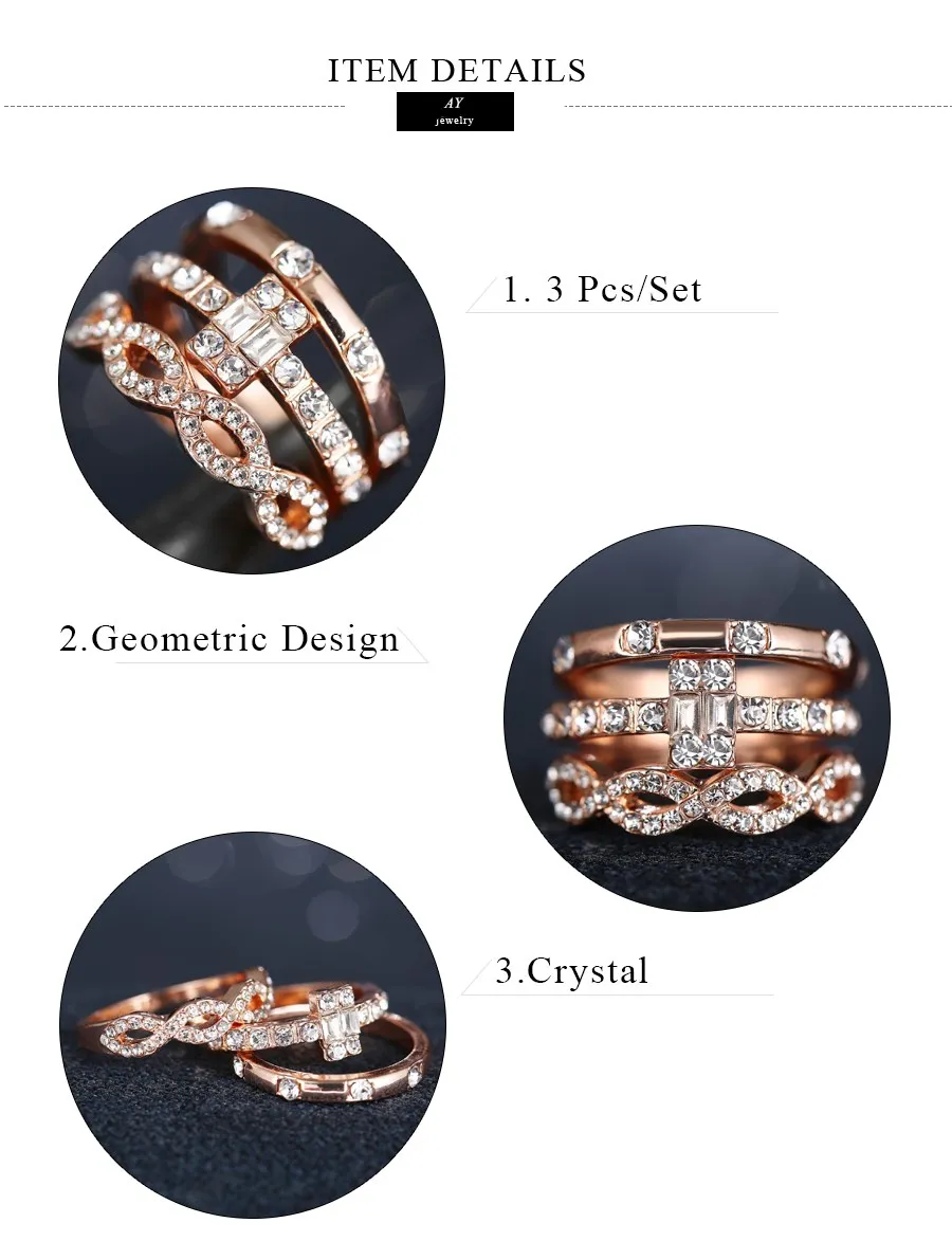 AY 3Pcs/Set Fashion Geometry Intersect Crystal Rings Set For Women Girls Engagement Wedding Rings Female Party Jewelry Gifts