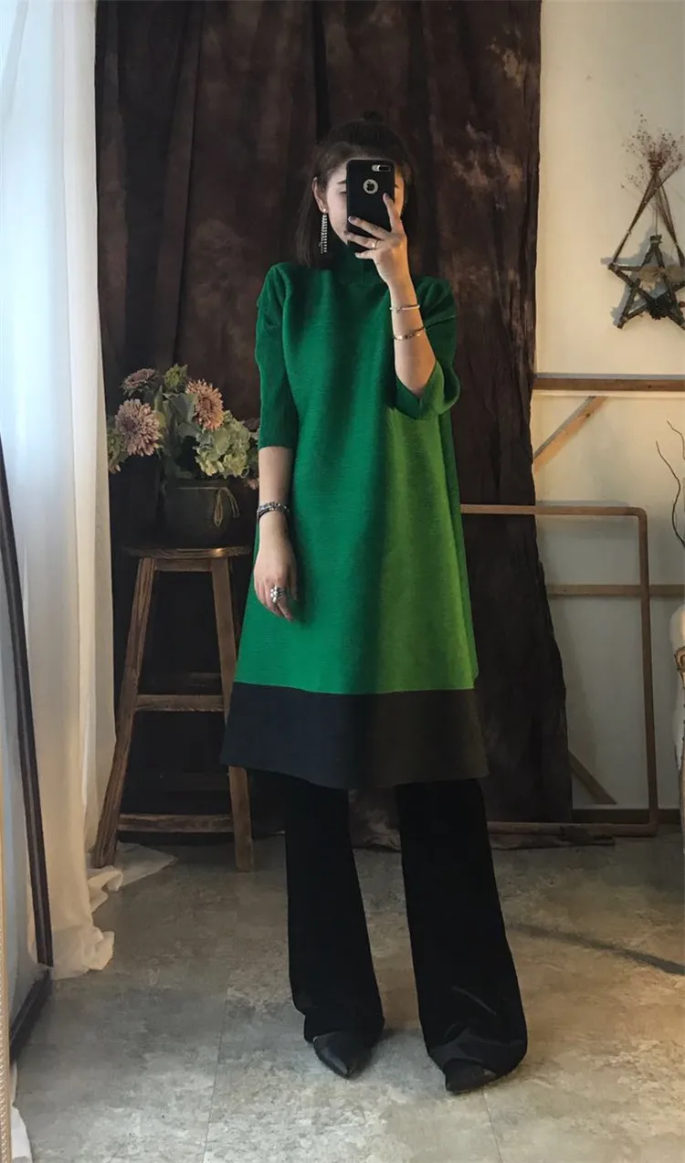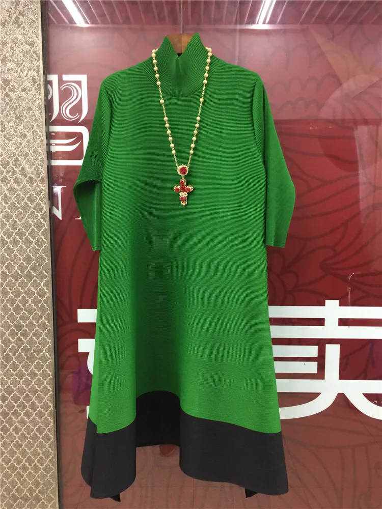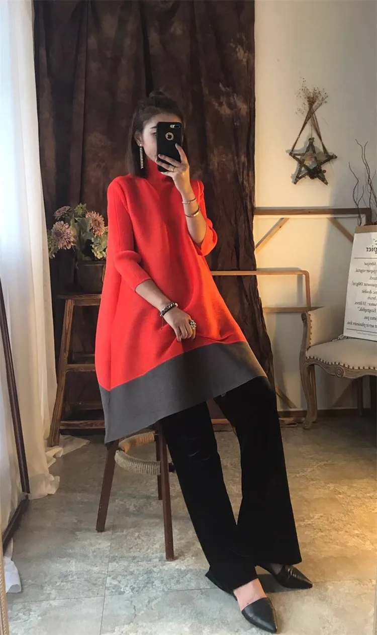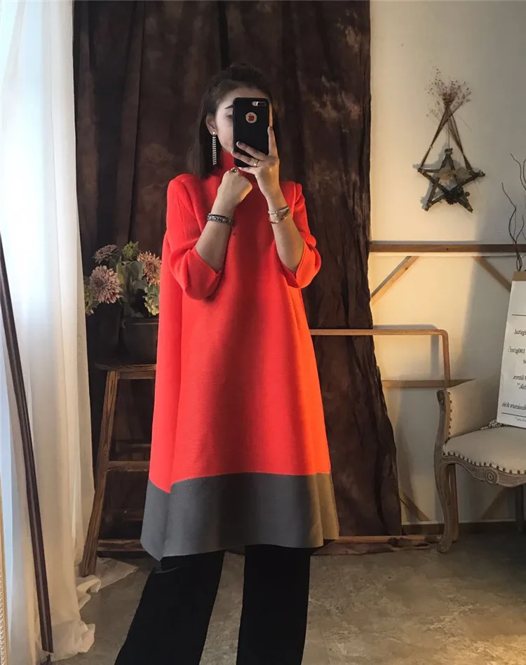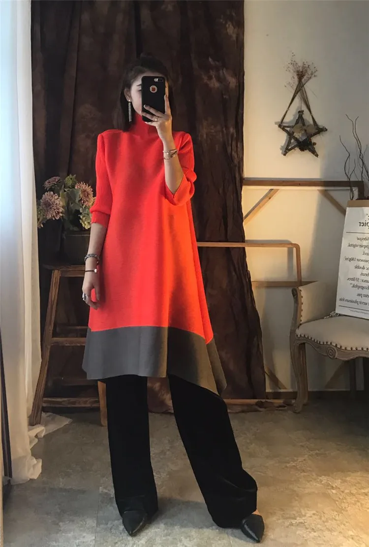 Azterumi Issey Miyake Autumn New 2018 Women Fashion A-line Dress Female Elegant Turtleneck Dresses Ladies Black Orange Vestidos